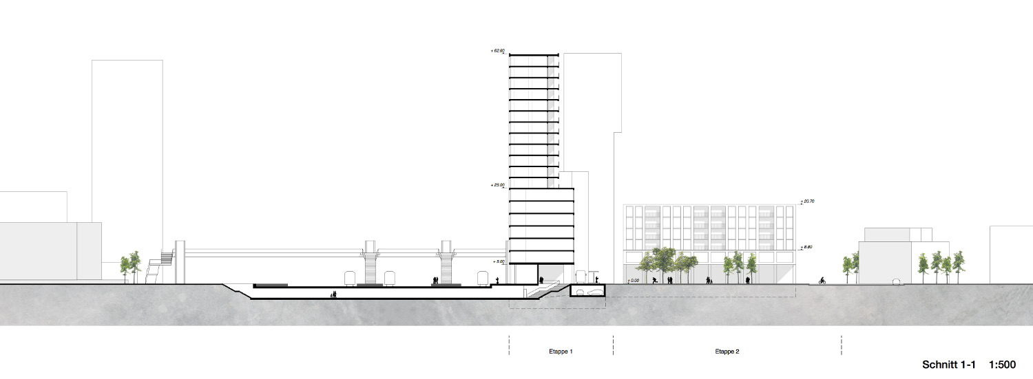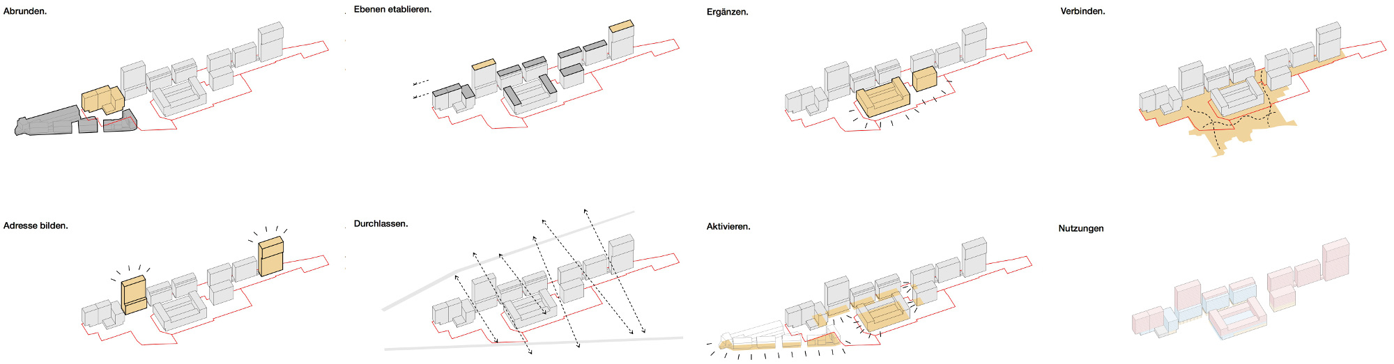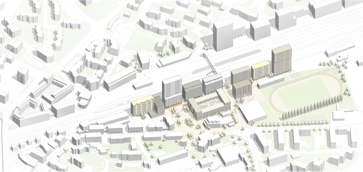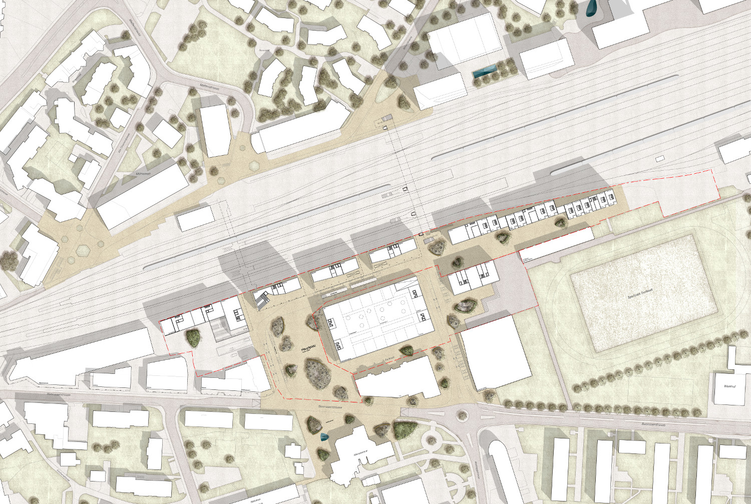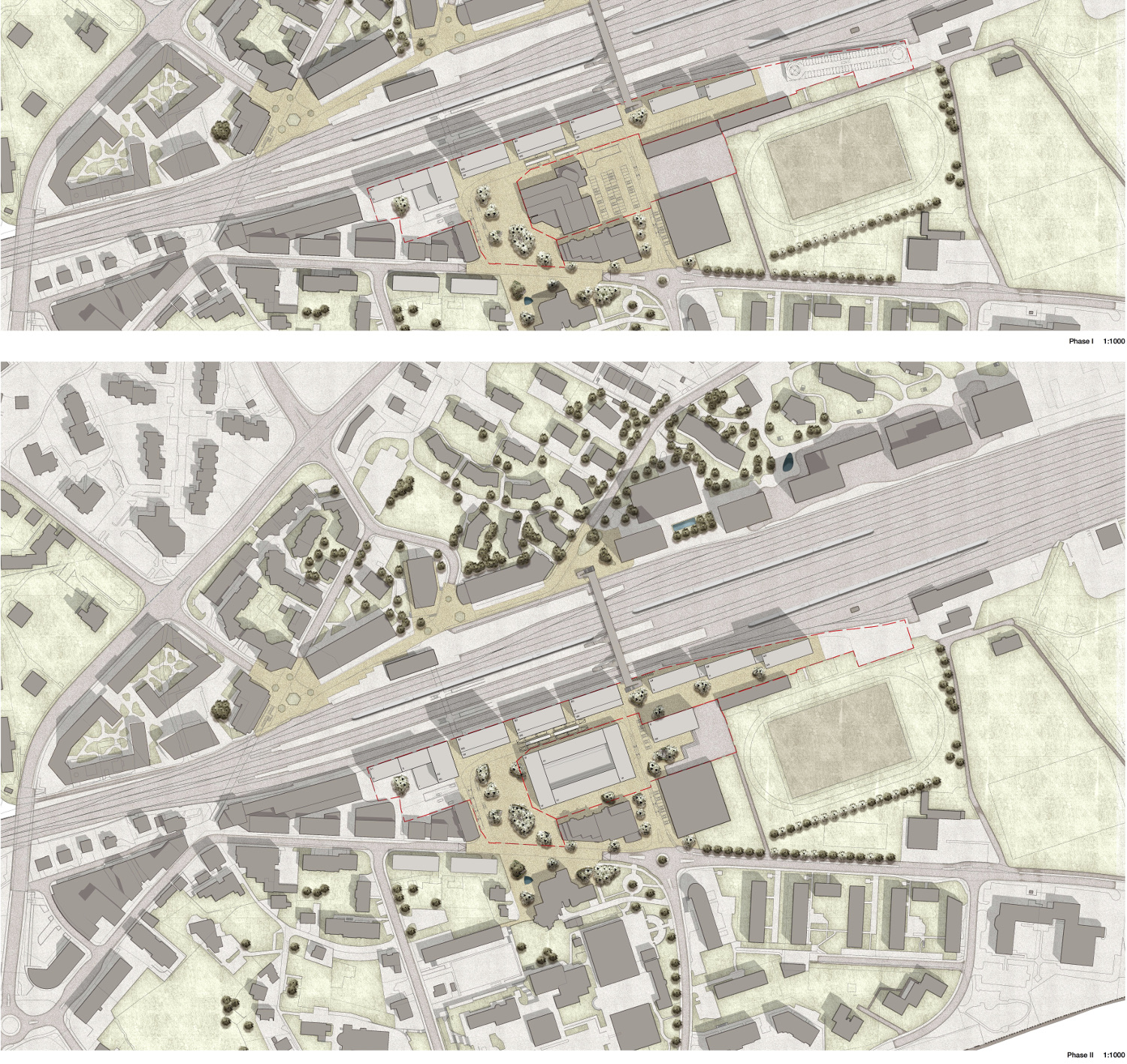 Der Bahnhof Rotkreuz hat eine Scharnierfunktion zwischen dem neuen Ortsteil nördlich der Gleise und dem historischen Ortskern im Süden, die heute über unattraktive Verbindungen miteinander verbunden sind. Das Projekt entwickelt Massnahmen um der Barrierewirkung der Bahngleise entgegenzuwirken und den historischen Ortsteil im Süden zu stärken. Am Bahnhofsplatz entsteht durch eine präzise Setzung von aktivierenden Erdgeschossnutzungen mit breitem Nutzungsangeboten ein neuer Schwerpunkt, der eine identitätsstiftende Funktion für Rotkreuz übernimmt. Die einzelnen Teilräume werden mit neuen Bausteinen ergänzt und in einem teppichartigen Freiraum gefasst und miteinander verwoben. Die städtebauliche Setzung und deren Rhythmus nehmen Bezug auf die Bebauung nördlich der Bahngleise und entwickeln visuelle Bezüge über das Gleisfeld hinweg zwischen der Nord- und Südseite.