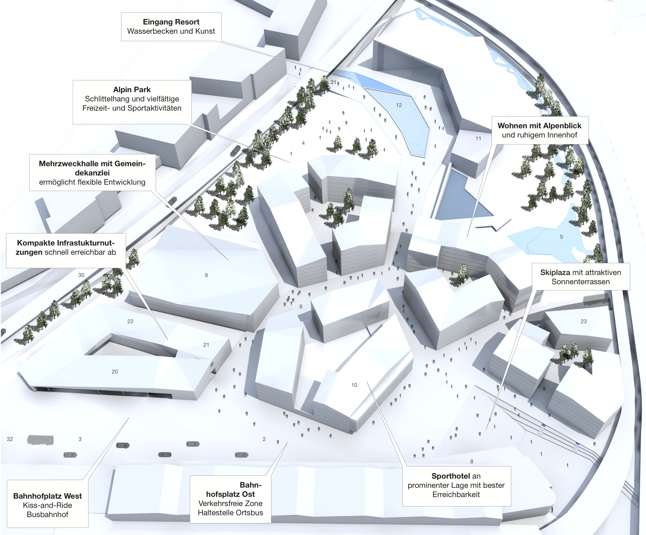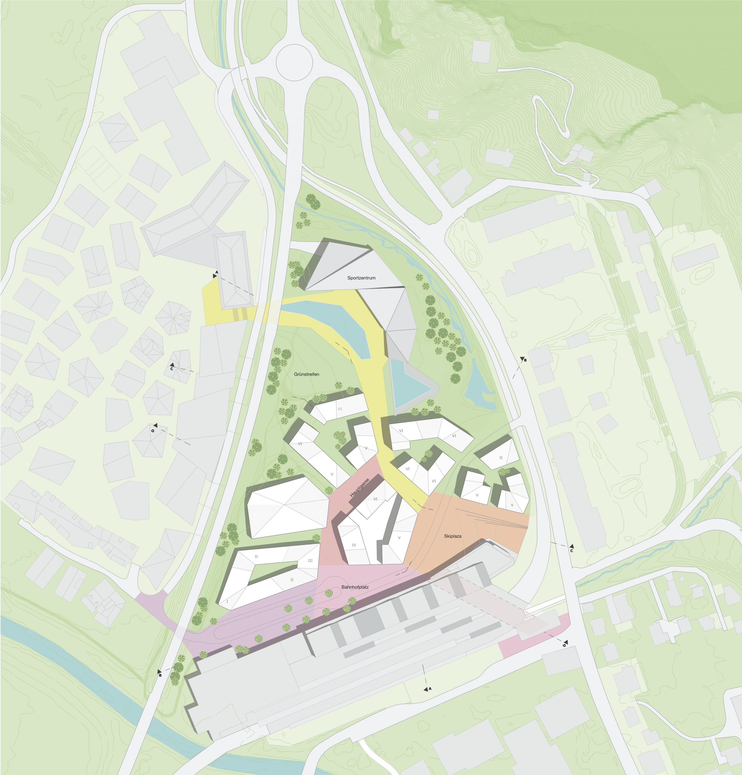 Andermatt ist ein beliebtes Tourismusziel in den Schweizer Alpen. Das kleine historische Dorf entwickelt sich zu einem wichtigen Tourismusziel und das Bahnhofsareal spielt dabei eine wichtige Rolle. Das neue Quartier rund um den Bahnhof soll ein neues Urlaubsresort mit dem alten Dorfkern von Andermatt verbinden. Der Entwurf basiert auf einer sorgfältig entworfenen Abfolge von urbaner Promenaden und Plätzen, die ein gute Orientierung bieten. Das neue Quartier bietet Dienstleistungen, Wohnen und verschiedene Freizeitaktivitäten. Ziel ist es urbane Momente in die Berge zu bringen und ein neues qualitative hochstehendes Zentrum zu definieren. Die entwickelten Typologien stehen in Relation zur Umgebung und reinterpretieren die regionalen Traditionen.