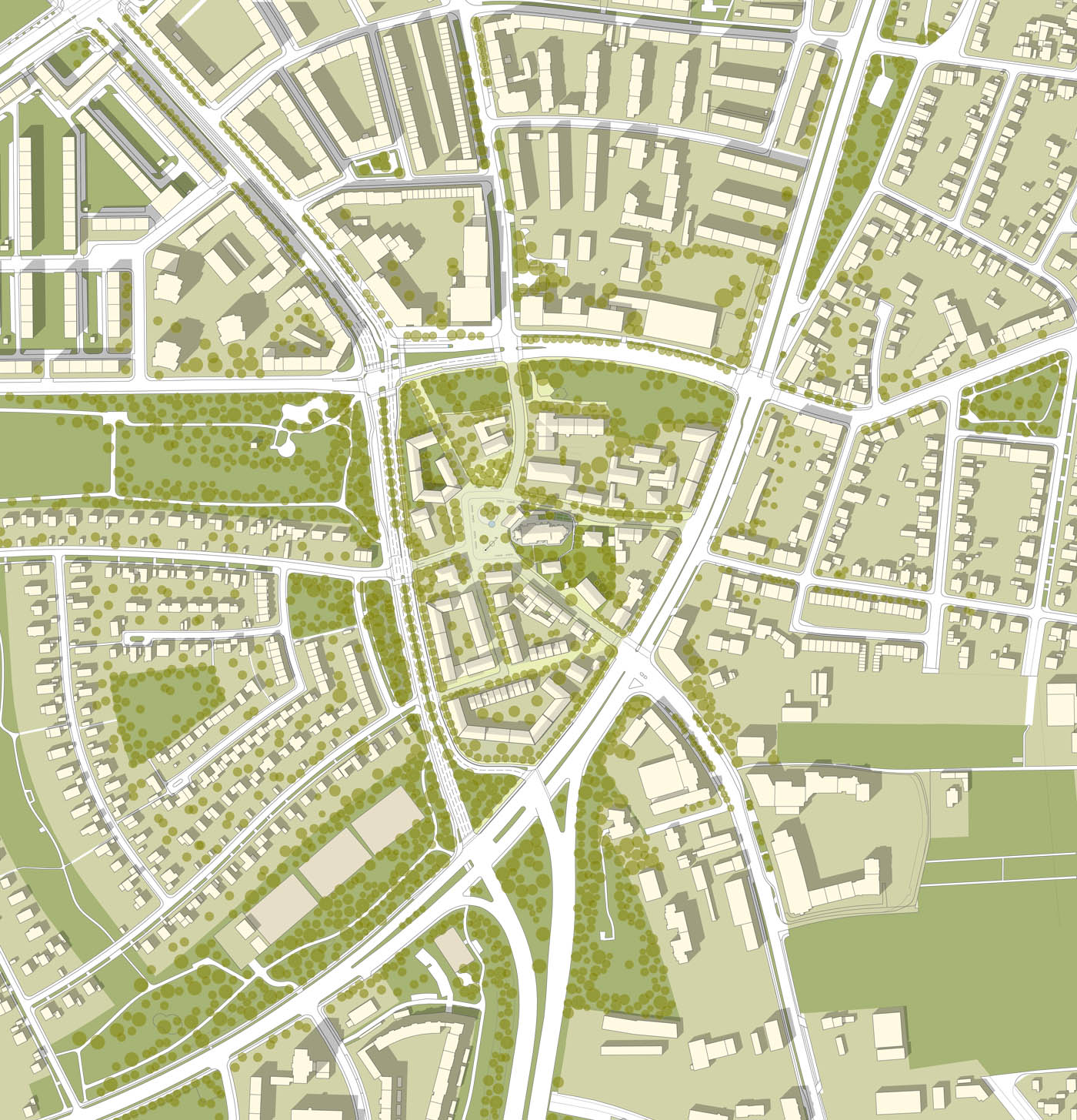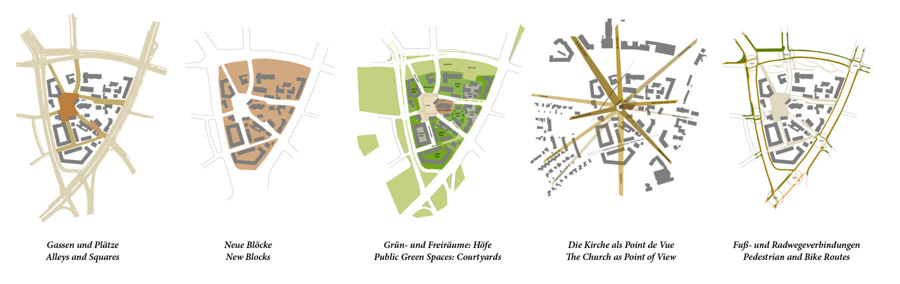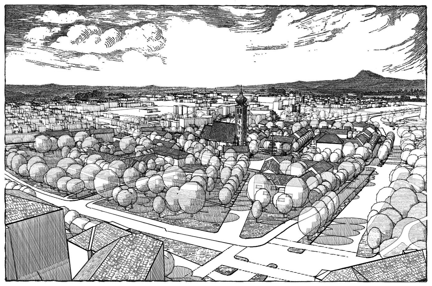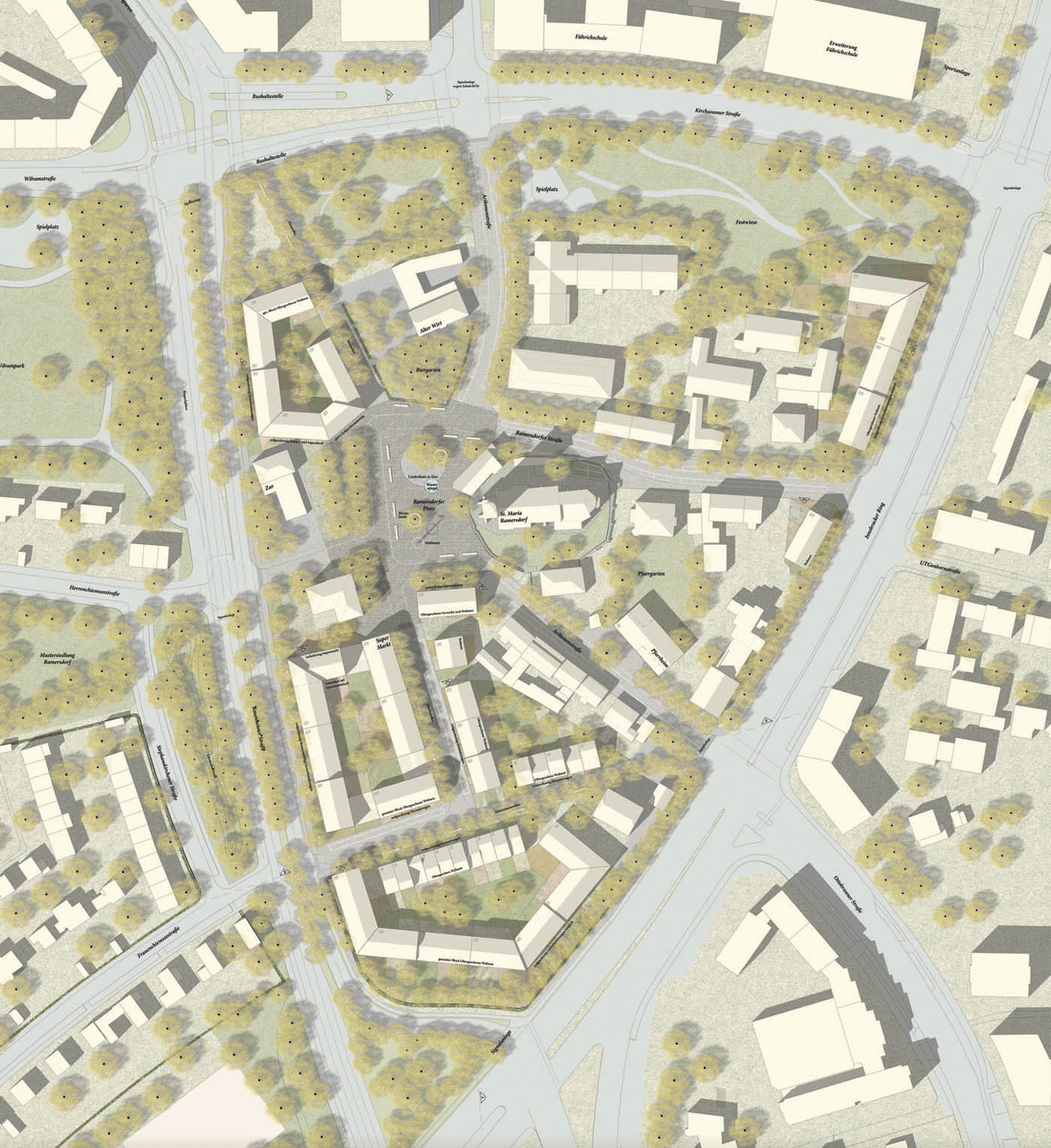 Der alte Ortskern Ramersdorf, heutzutage vollkommen vom Münchner Stadtgefüge umschlossen, ist vor allem für seine Wallfahrtskirche bekannt. Diese steht unter Denkmalschutz und gemeinsam mit den unmittelbar angrenzenden Gebäuden und Grünflächen unter Ensembleschutz. Eine grundlegende Neuordnung der umlaufenden Strassen schafft neuen Raum für eine Verdichtung und Neubewertung des räumlichen Gefüges. Das Projekt zeichnet sich durch einen behutsamen Prozess, in dem neue Gebäude ergänzend so angeordnet werden, dass bestehende Qualitäten geschärft und verstärkt werden und neue Wegebeziehungen geschaffen werden. Dabei entstehen neue adäquate Strassenräume und Hofsituationen, die die bestehende Struktur selbstverständlich ergänzen und mit den angrenzenden Nachbarschaften verknüpfen. Vertiefende Studien hinsichtlich der Bestandsbauten und erhaltenswerten Baumstrukturen und eine mit den Bestandsbauten vergleichbare Körnigkeit garantieren die fortdauernde Identifikation der Anwohner. Gleichzeitig werden neue Einrichtungen wie ein Pfarrheim und ein Nahversorger mit dem öffentlichen Raum so verwoben, dass neue Impulse für den Ortskern geschaffen werden können.