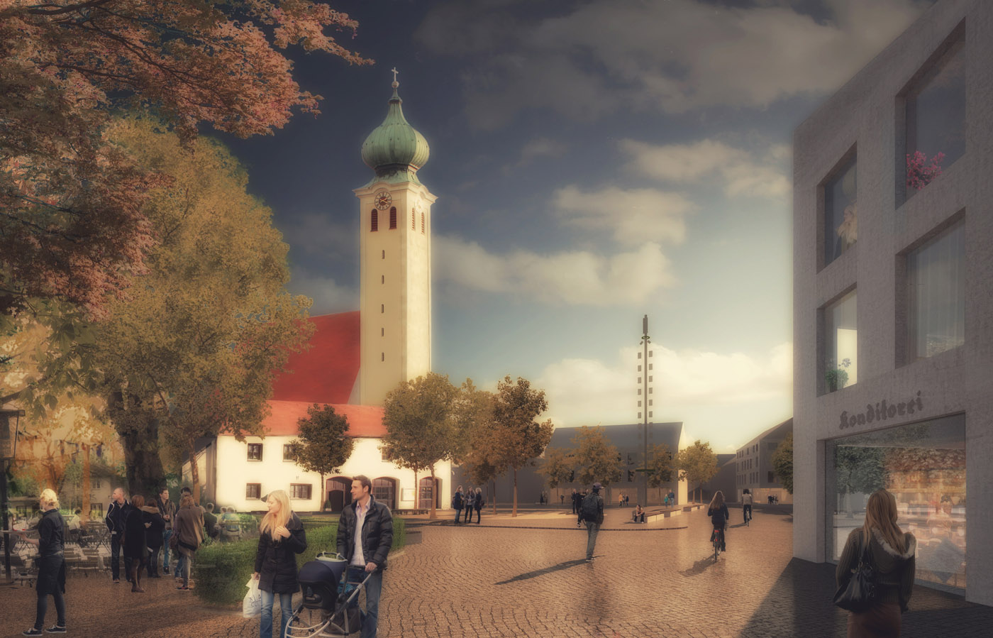 Der alte Ortskern Ramersdorf, heutzutage vollkommen vom Münchner Stadtgefüge umschlossen, ist vor allem für seine Wallfahrtskirche bekannt. Diese steht unter Denkmalschutz und gemeinsam mit den unmittelbar angrenzenden Gebäuden und Grünflächen unter Ensembleschutz. Eine grundlegende Neuordnung der umlaufenden Strassen schafft neuen Raum für eine Verdichtung und Neubewertung des räumlichen Gefüges. Das Projekt zeichnet sich durch einen behutsamen Prozess, in dem neue Gebäude ergänzend so angeordnet werden, dass bestehende Qualitäten geschärft und verstärkt werden und neue Wegebeziehungen geschaffen werden. Dabei entstehen neue adäquate Strassenräume und Hofsituationen, die die bestehende Struktur selbstverständlich ergänzen und mit den angrenzenden Nachbarschaften verknüpfen. Vertiefende Studien hinsichtlich der Bestandsbauten und erhaltenswerten Baumstrukturen und eine mit den Bestandsbauten vergleichbare Körnigkeit garantieren die fortdauernde Identifikation der Anwohner. Gleichzeitig werden neue Einrichtungen wie ein Pfarrheim und ein Nahversorger mit dem öffentlichen Raum so verwoben, dass neue Impulse für den Ortskern geschaffen werden können.