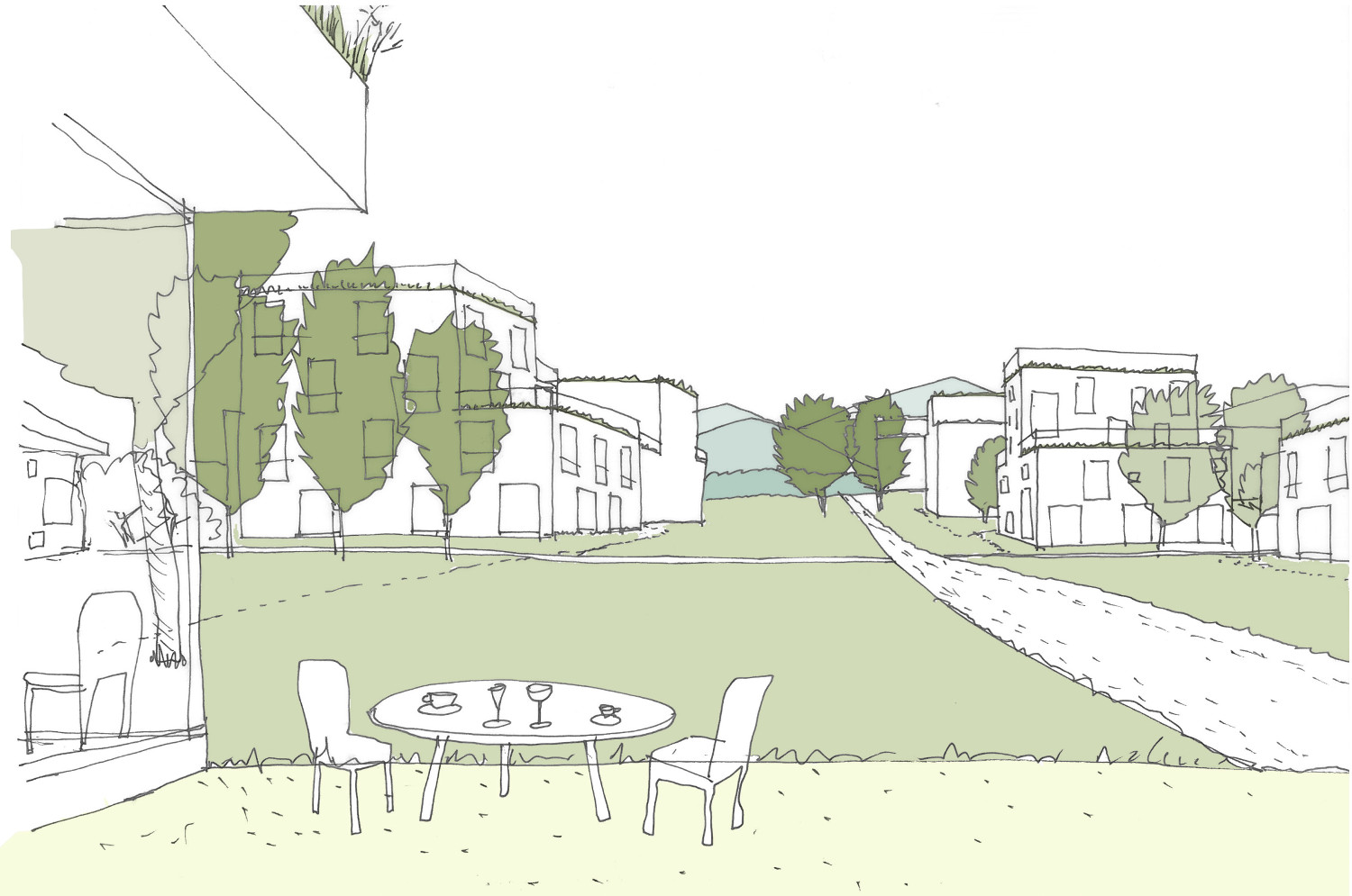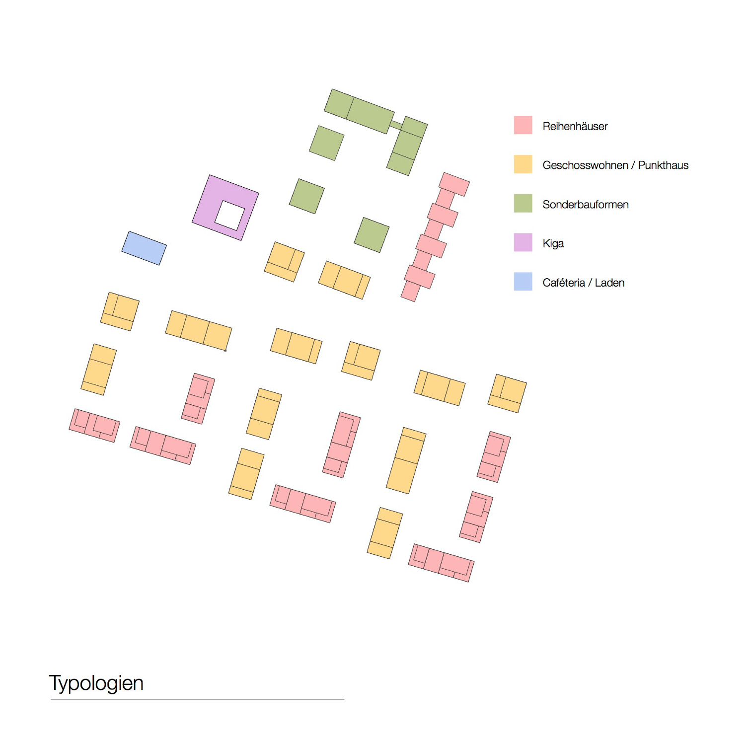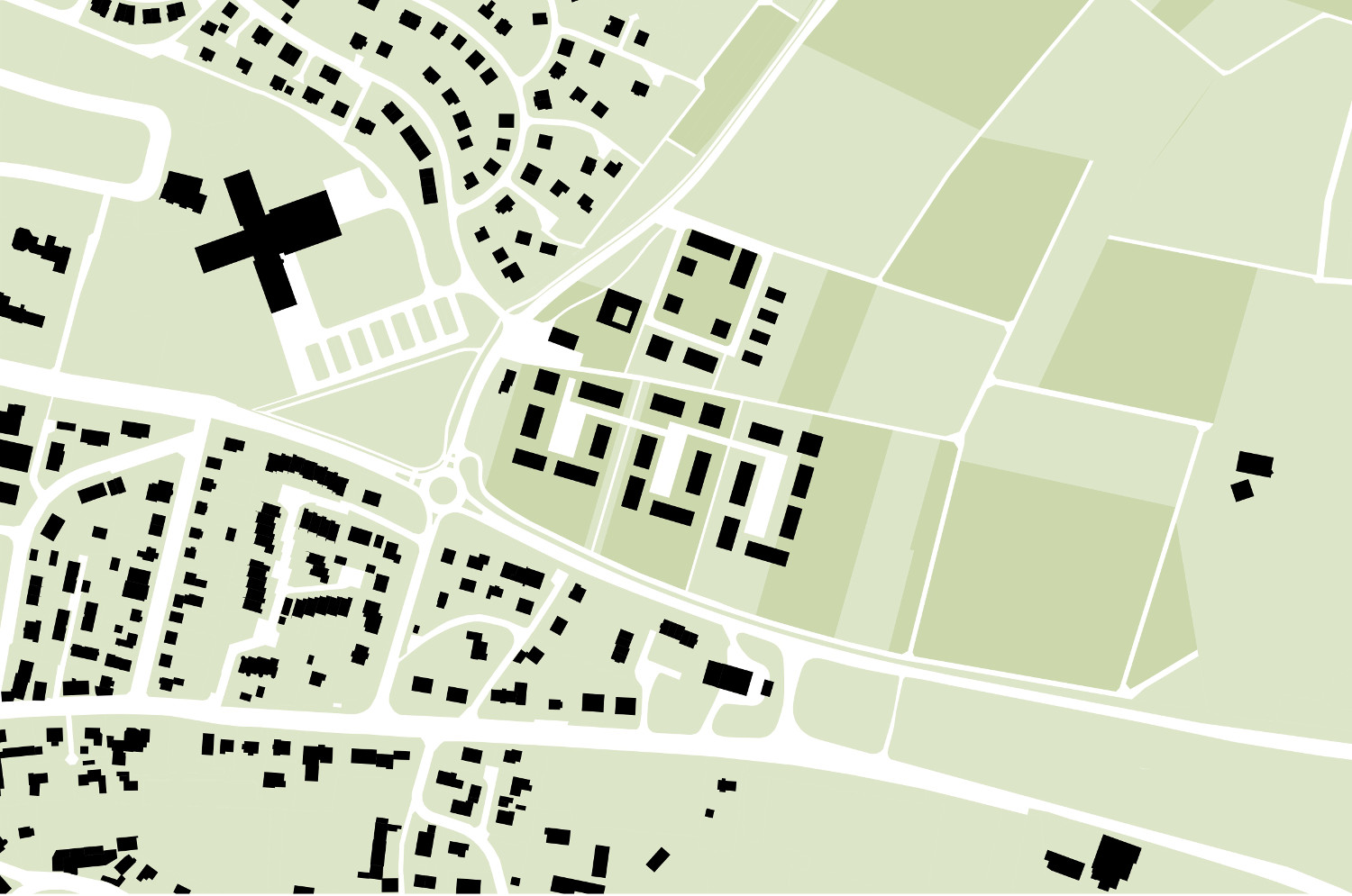Städtebauliches Konzept – Am östlichen Ortsrand entsteht ein neuer Ortsteil, der am Übergang von Siedlung zu freier Landschaft zwischen Stadt und freier Landschaft vermittelt. Die Bebauung rückt im Süden von der Schwarzwaldstrasse ab und erhält so die weite Sicht in die Landschaft mit dem Schwarzwaldgebirge und dem Blauen im Hintergrund. Der Platz, der sich zwischen Bestandsgebäude, Cafe und Wohnhaus aufspannt, bildet den räumlichen Anknüpfungspunkt zum Ort und schafft eine Anbindung zum Fuss- und Radweg Richtung Stadtmitte, welcher sich westlich der Sulzburgerstrasse befindet. Entlang der zentralen Achse um den bestehenden Feldweg entsteht eine Raumabfolge von bebautem Raum zu offener Landschaft, die durch die bestehenden Obstbaumreihen gestaffelt wird: Platz, Kiga, Freiraum, Naturdenkmäler (Portalsituation), Naturspielplatz, offene Landschaft, Friedhof, Reblandschaft und Berge. Der zentrale Freiraum gliedert das Gebiet in zwei Cluster nördlich und südlich davon, die sich jeweils an der bestehenden Feldstruktur ausrichten und durch die bestehenden Obstbaumreihen gegliedert werden. Die differenzierte Höherentwicklung und das Abrücken der Bebauung tragen den Nachbarn Respekt, schaffen einen Vielfalt an Wohnangebote und Diversität. Die Anordnung der Wohngebäude um entspannte Gemeinschaftsgärten sorgt für sozialen Zusammenhalt.