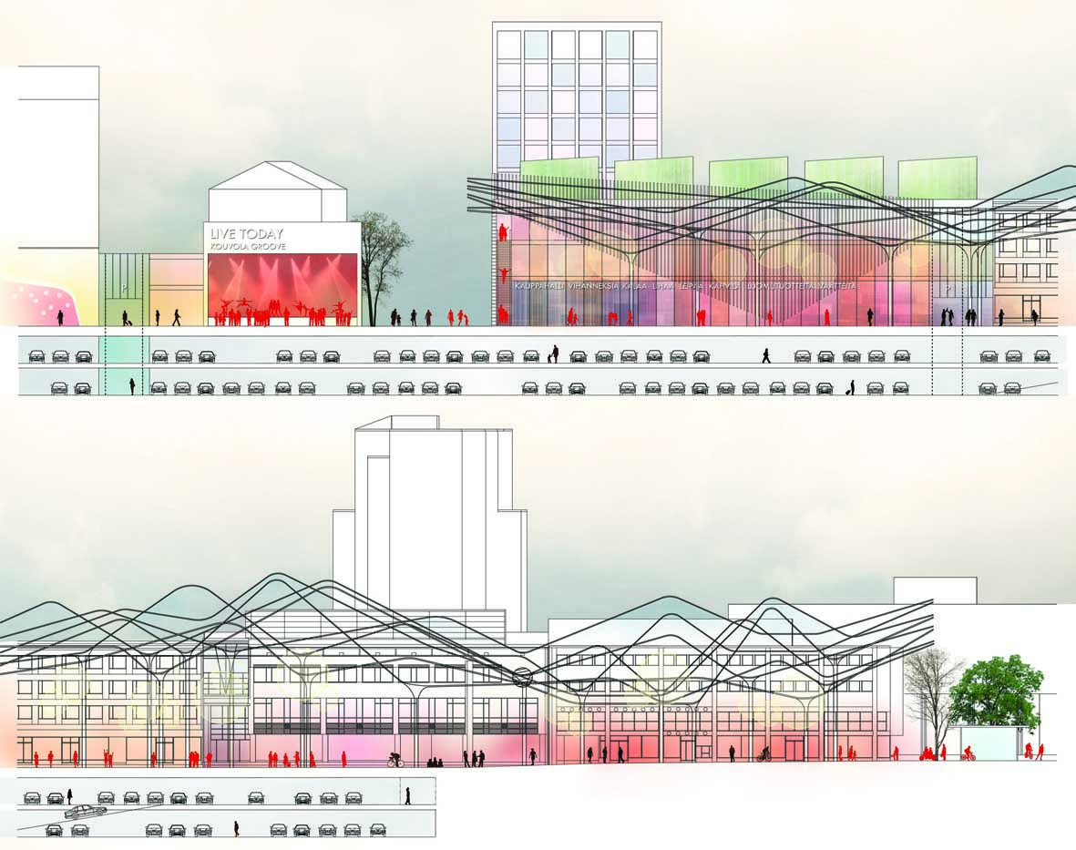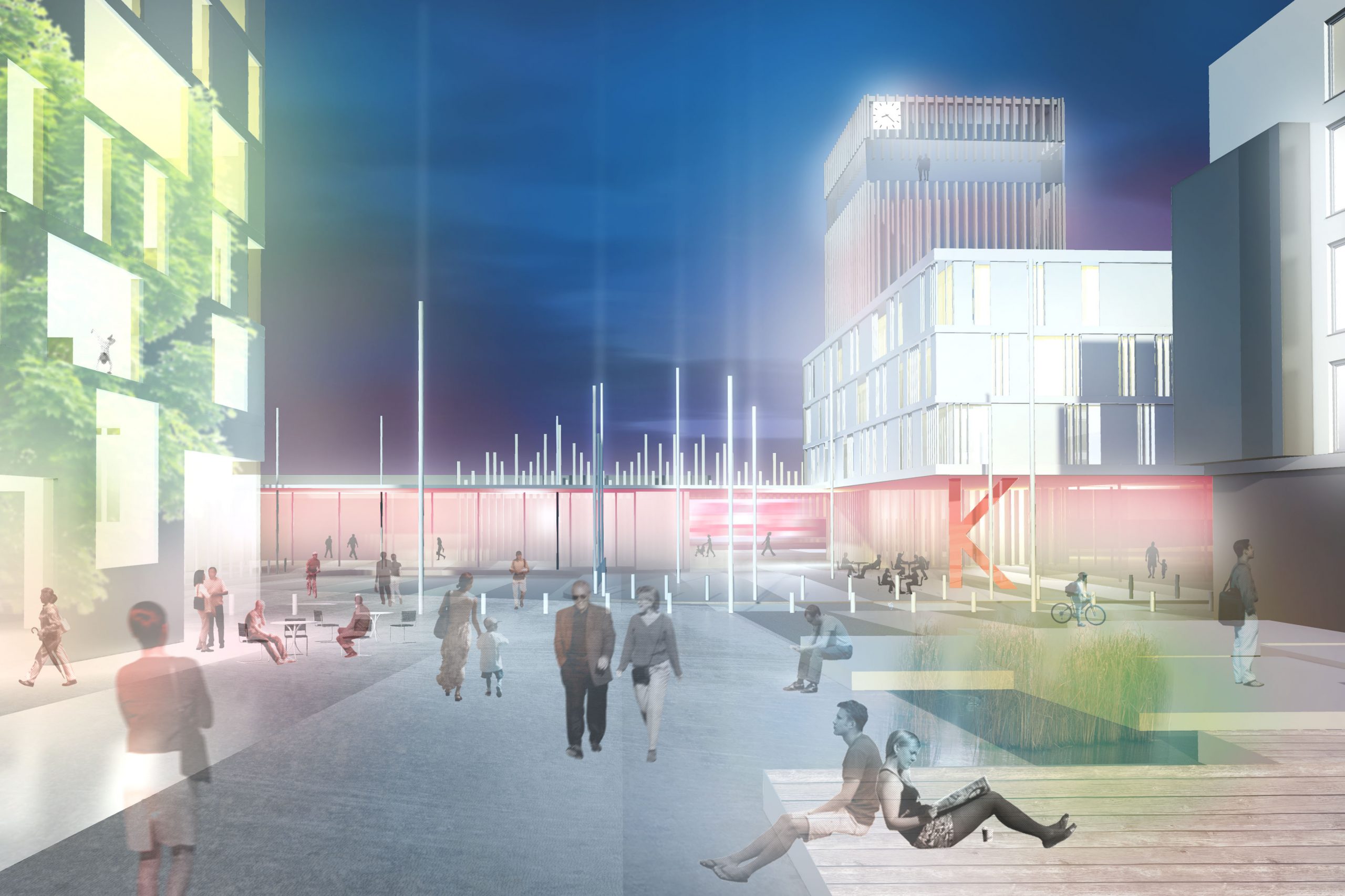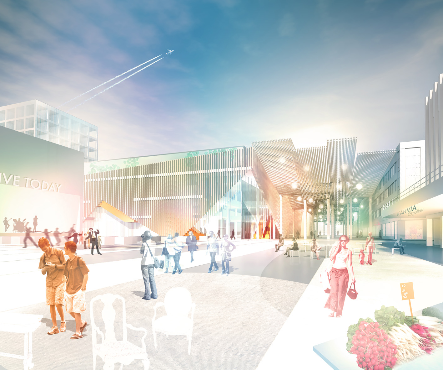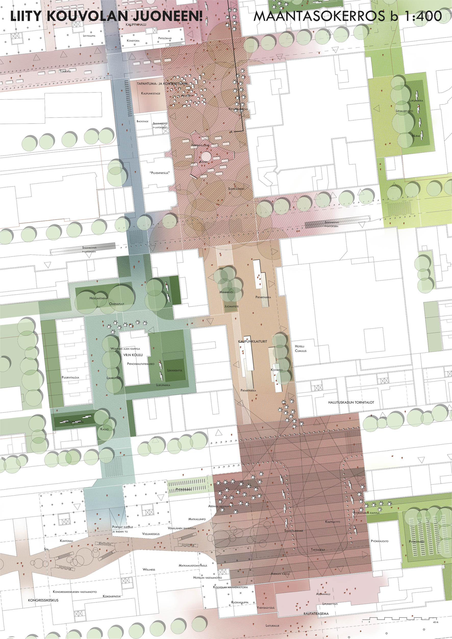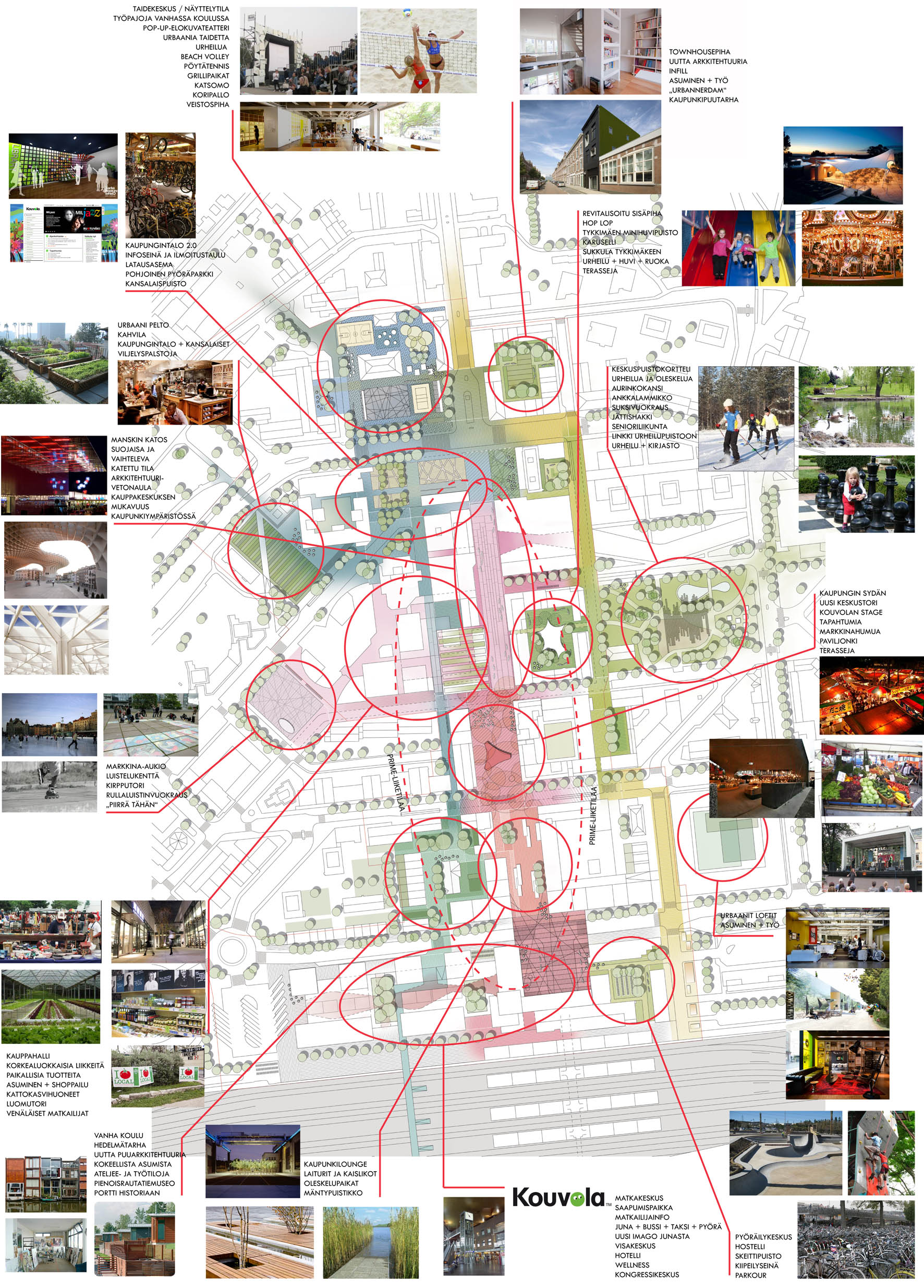 Kouvola ist eine Stadt mit ca. 80.000 Einwohnern im Südosten Finnlands. Kouvola ist ein wichtiger Eisenbahnknotenpunkt und liegt an der Bahnlinie von Helsinki nach St. Petersburg. Wettbewerbsaufgabe war es, Strategien zu entwickeln, die das Zentrum beleben. Die wichtigsten Merkmale des Projekts sind drei neue urbane Knoten entlang der Hauptachse der Stadt: ein aufgewerteter Bahnhofsbereich mit einem neuen Reise-Center im Süden, einem umgestalteten zentralen Platz, einer Überdachung und einer Markthalle in der Mitte der Hauptachse sowie ein kultureller Knotenpunkt rund um das Rathaus und das alte Schulgebäude im Norden. Der Plan baut auf den bestehenden Qualitäten auf und schlägt eine Kombination von Interventionen und Neubauten vor.