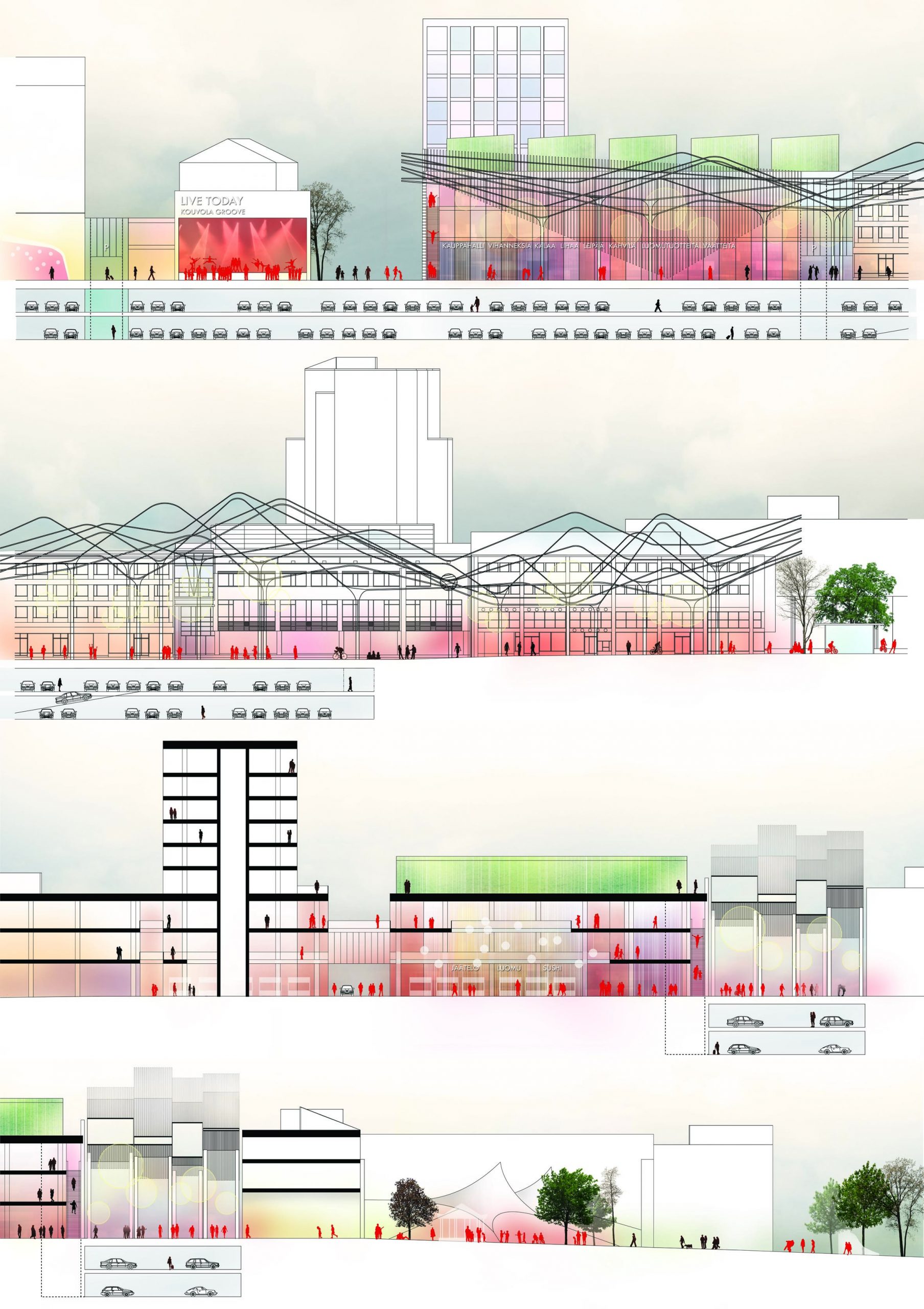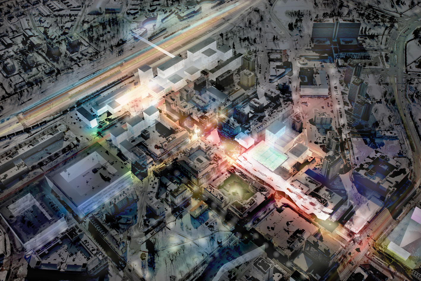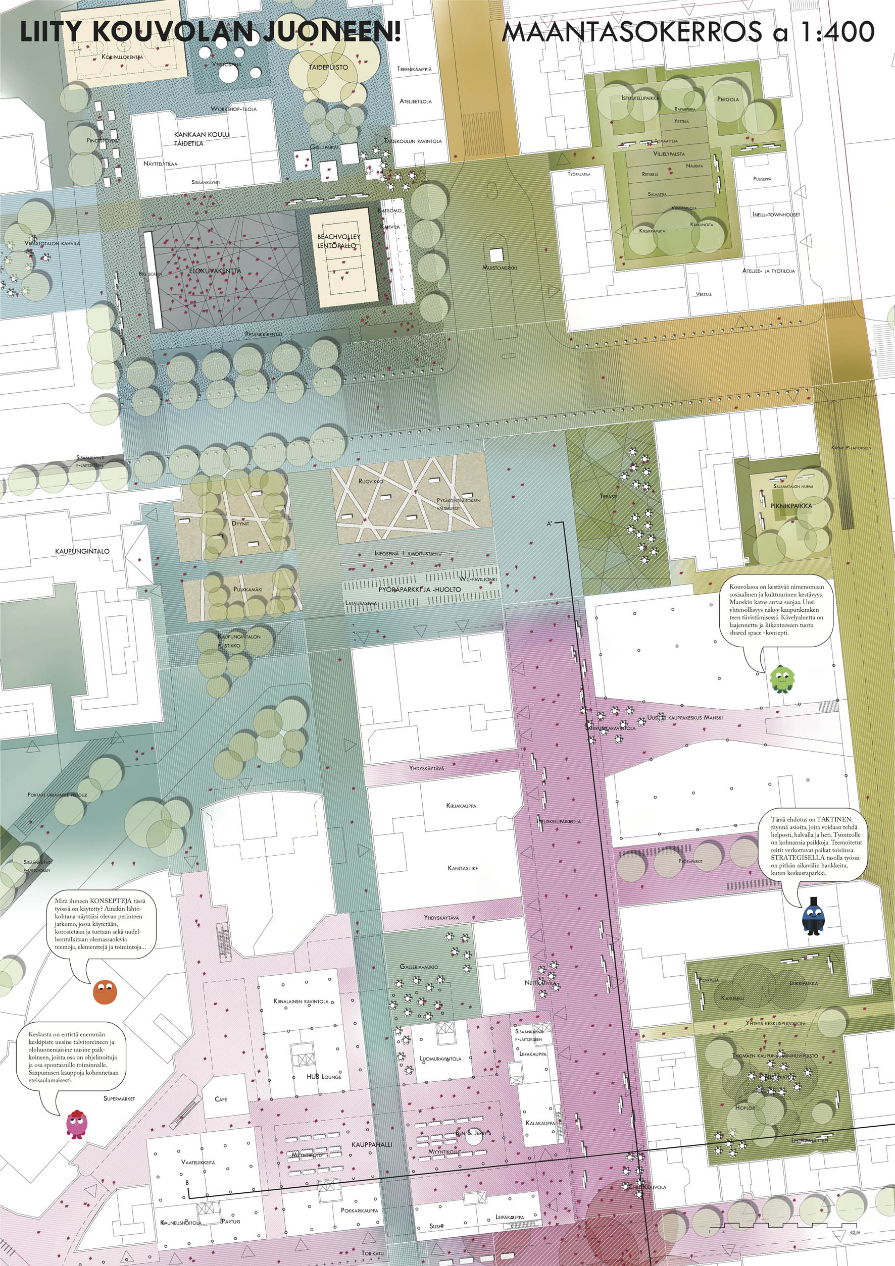 Kouvola ist eine Stadt mit ca. 80.000 Einwohnern im Südosten Finnlands. Kouvola ist ein wichtiger Eisenbahnknotenpunkt und liegt an der Bahnlinie von Helsinki nach St. Petersburg. Wettbewerbsaufgabe war es, Strategien zu entwickeln, die das Zentrum beleben. Die wichtigsten Merkmale des Projekts sind drei neue urbane Knoten entlang der Hauptachse der Stadt: ein aufgewerteter Bahnhofsbereich mit einem neuen Reise-Center im Süden, einem umgestalteten zentralen Platz, einer Überdachung und einer Markthalle in der Mitte der Hauptachse sowie ein kultureller Knotenpunkt rund um das Rathaus und das alte Schulgebäude im Norden. Der Plan baut auf den bestehenden Qualitäten auf und schlägt eine Kombination von Interventionen und Neubauten vor.