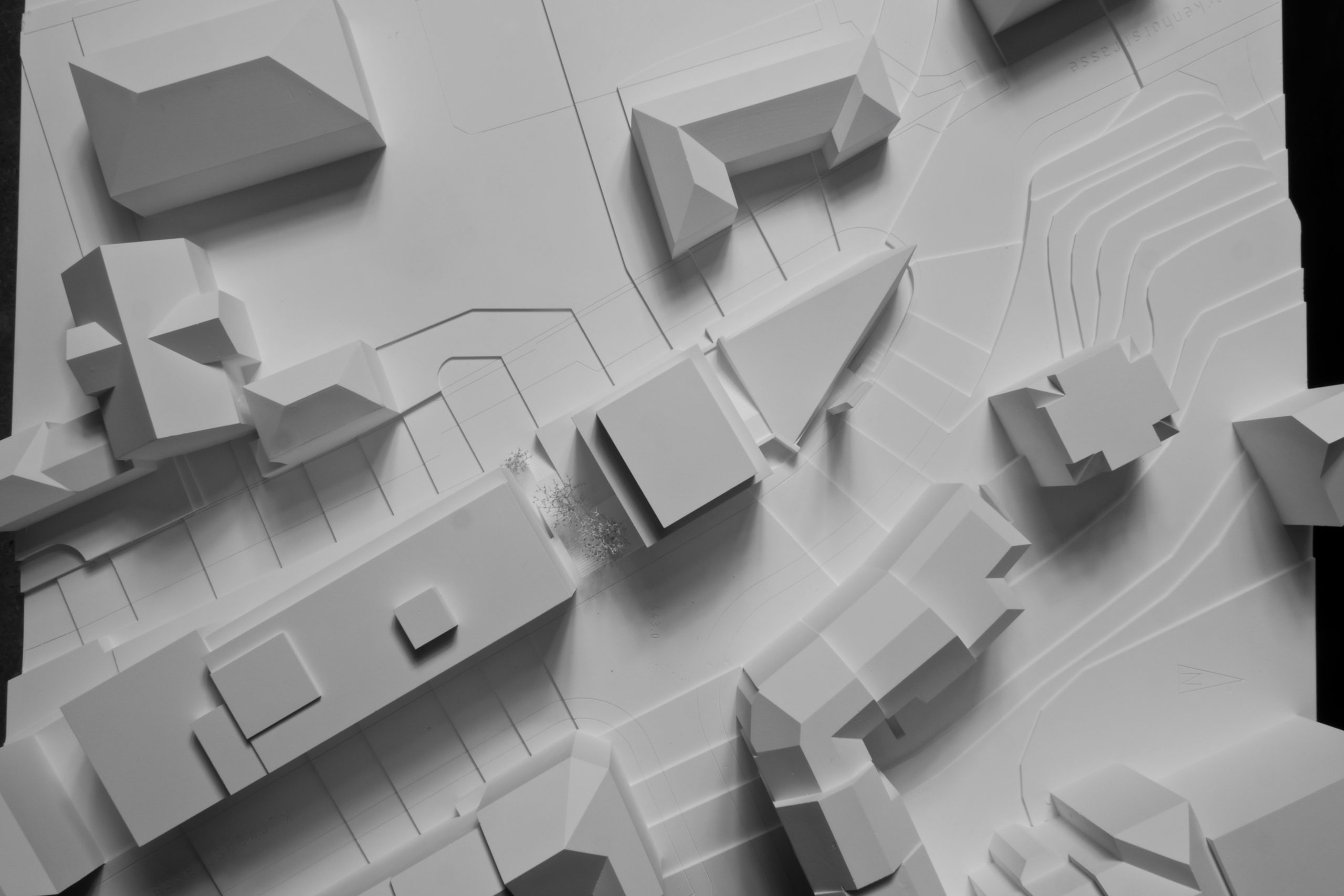 Neben der denkmalgeschützten Kirche entsteht ein Neubau mit Räumen für die Kirchgemeinde sowie Wohnungen. Das vorliegende Projekt entspringt dem Wunsch, die Teile des Ensembles in ein klareres Verhältnis zueinander zu setzen und dem expressiven Sakralbau deutlicher den Hauptauftritt zu überlassen, indem sich der Neubau etwas zurücknimmt. Der Neubau weist dementsprechend eine geometrisch einfache Kubatur auf und ist vom Kirchenschiff abgerückt. Zwischen den beiden Teilen des Ensembles entsteht dadurch – gewissermassen als gebaute Fuge – ein niedriger Zwischenbau mit einem neuen zentralen Eingangsfoyer. An der Kurvenstrasse springt er zurück und artikuliert damit den Nebenzugang zur Empore und zu einem neu geschaffenen Velounterstand. Das bestehende Eingangsportal erscheint nicht mehr als einseitig an die Kirche angelehnter Appendix, sondern fungiert neu als eigenständige Fassade des Zwischenbaus und wird durch ein hangwärts ansteigendes Dachvolumen bekrönt.