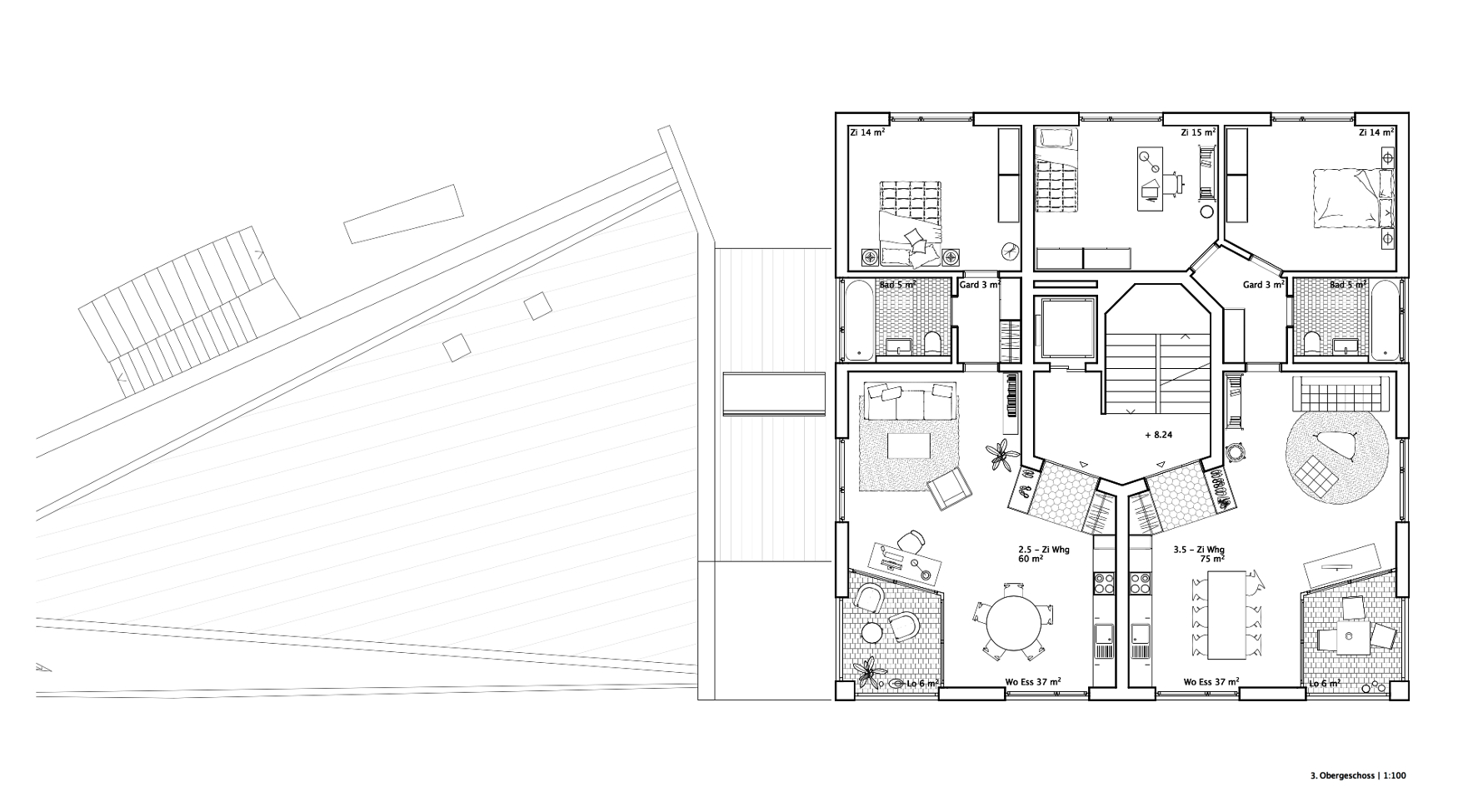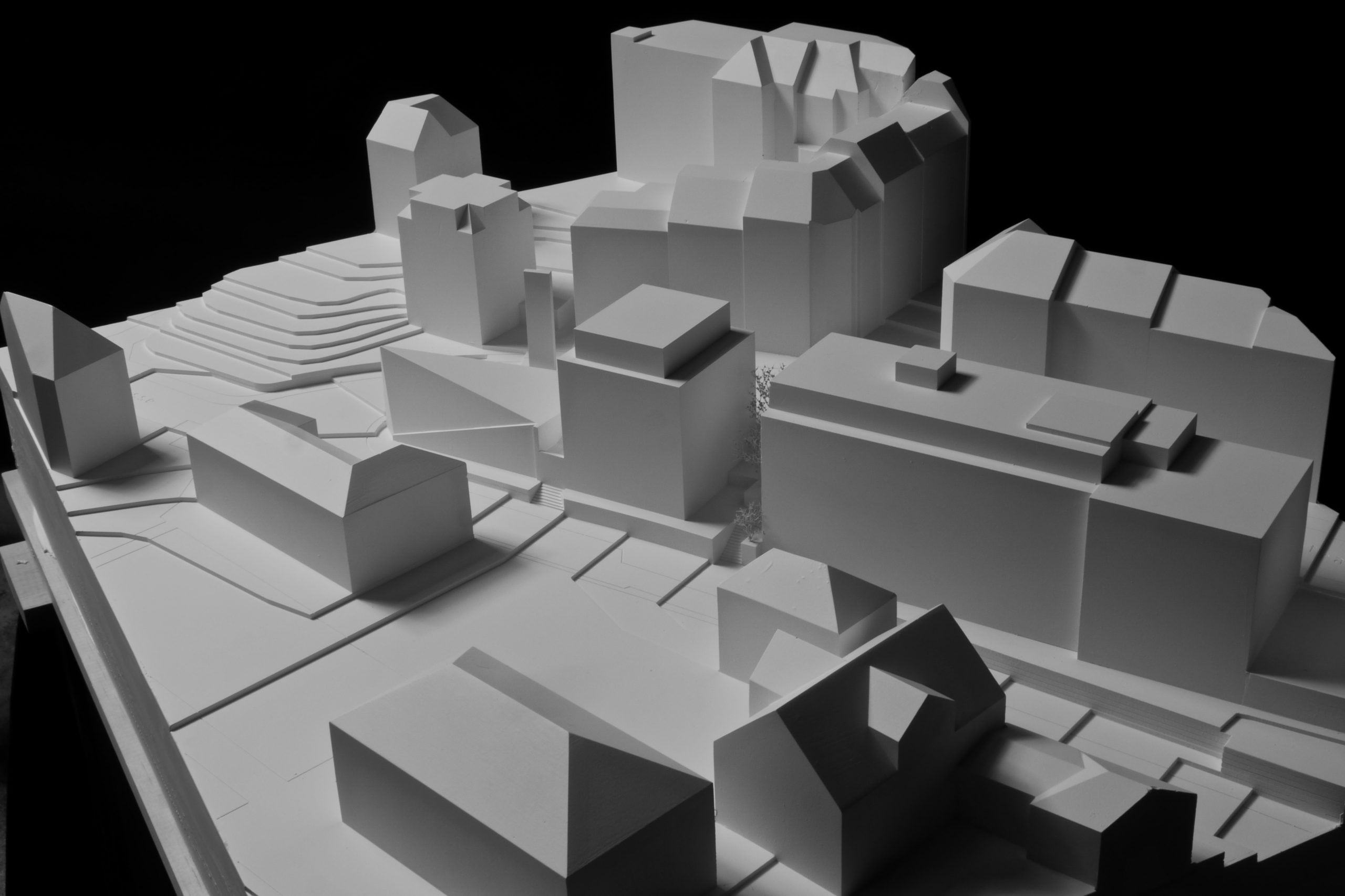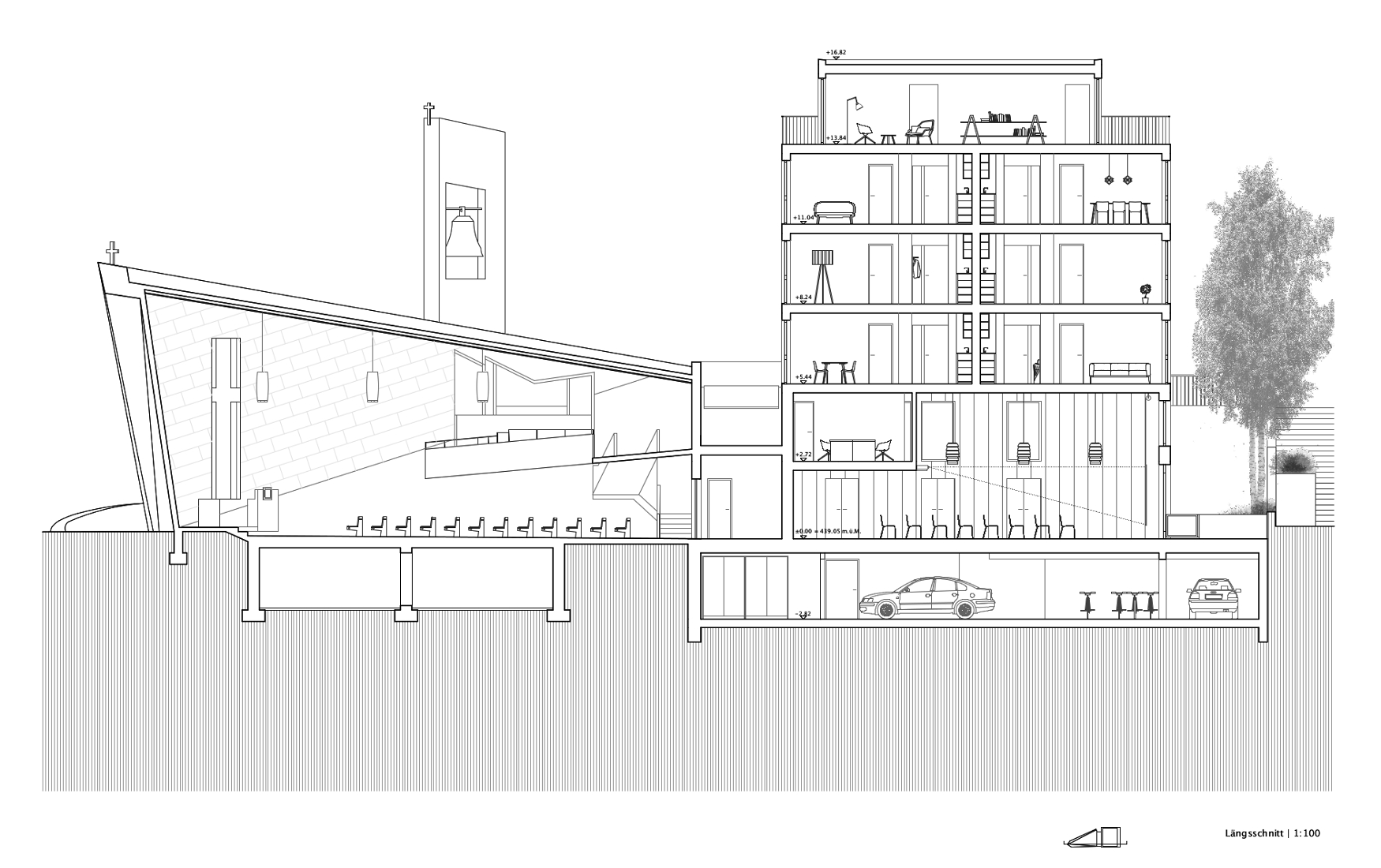 Neben der denkmalgeschützten Kirche entsteht ein Neubau mit Räumen für die Kirchgemeinde sowie Wohnungen. Das vorliegende Projekt entspringt dem Wunsch, die Teile des Ensembles in ein klareres Verhältnis zueinander zu setzen und dem expressiven Sakralbau deutlicher den Hauptauftritt zu überlassen, indem sich der Neubau etwas zurücknimmt. Der Neubau weist dementsprechend eine geometrisch einfache Kubatur auf und ist vom Kirchenschiff abgerückt. Zwischen den beiden Teilen des Ensembles entsteht dadurch – gewissermassen als gebaute Fuge – ein niedriger Zwischenbau mit einem neuen zentralen Eingangsfoyer. An der Kurvenstrasse springt er zurück und artikuliert damit den Nebenzugang zur Empore und zu einem neu geschaffenen Velounterstand. Das bestehende Eingangsportal erscheint nicht mehr als einseitig an die Kirche angelehnter Appendix, sondern fungiert neu als eigenständige Fassade des Zwischenbaus und wird durch ein hangwärts ansteigendes Dachvolumen bekrönt.