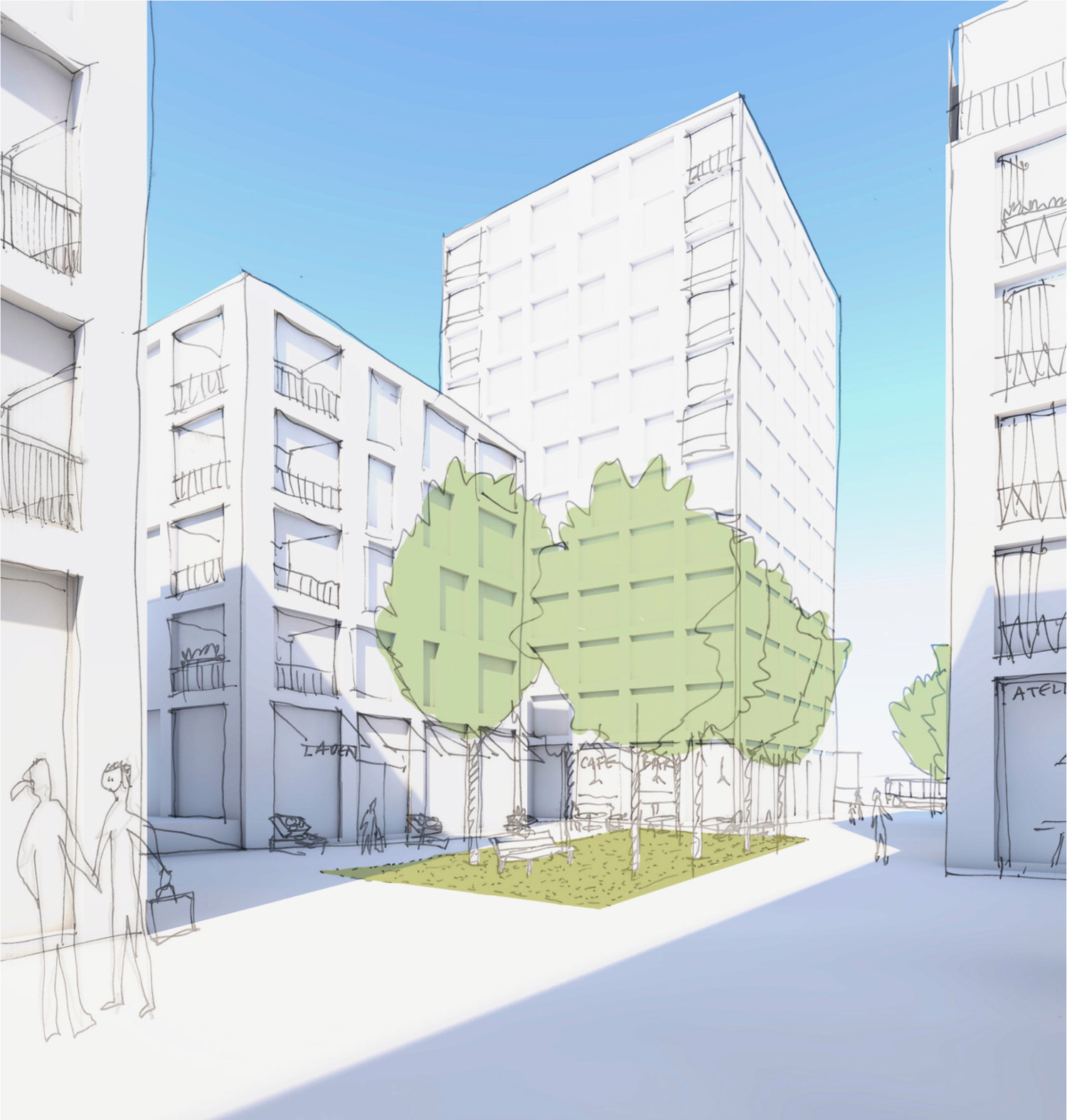 Our proposal was based on the strategy of bringing Bülach to the station and creating a new vibrant pedestrian-friendly place there. The bus station was organized around a new urban square which works as a stepping stone between the transit hub and the city. A high-rise mixed-use building marks the entry to the city and the new neighborhood. Mixed-use buildings enliven the Main Street and enable a more intimate and relaxed inner life for the small-scaled car-free ‘Herti’-area filled with live-and-work options. The concept gives Bülach a new urban interface linking the old center with the transit hub.