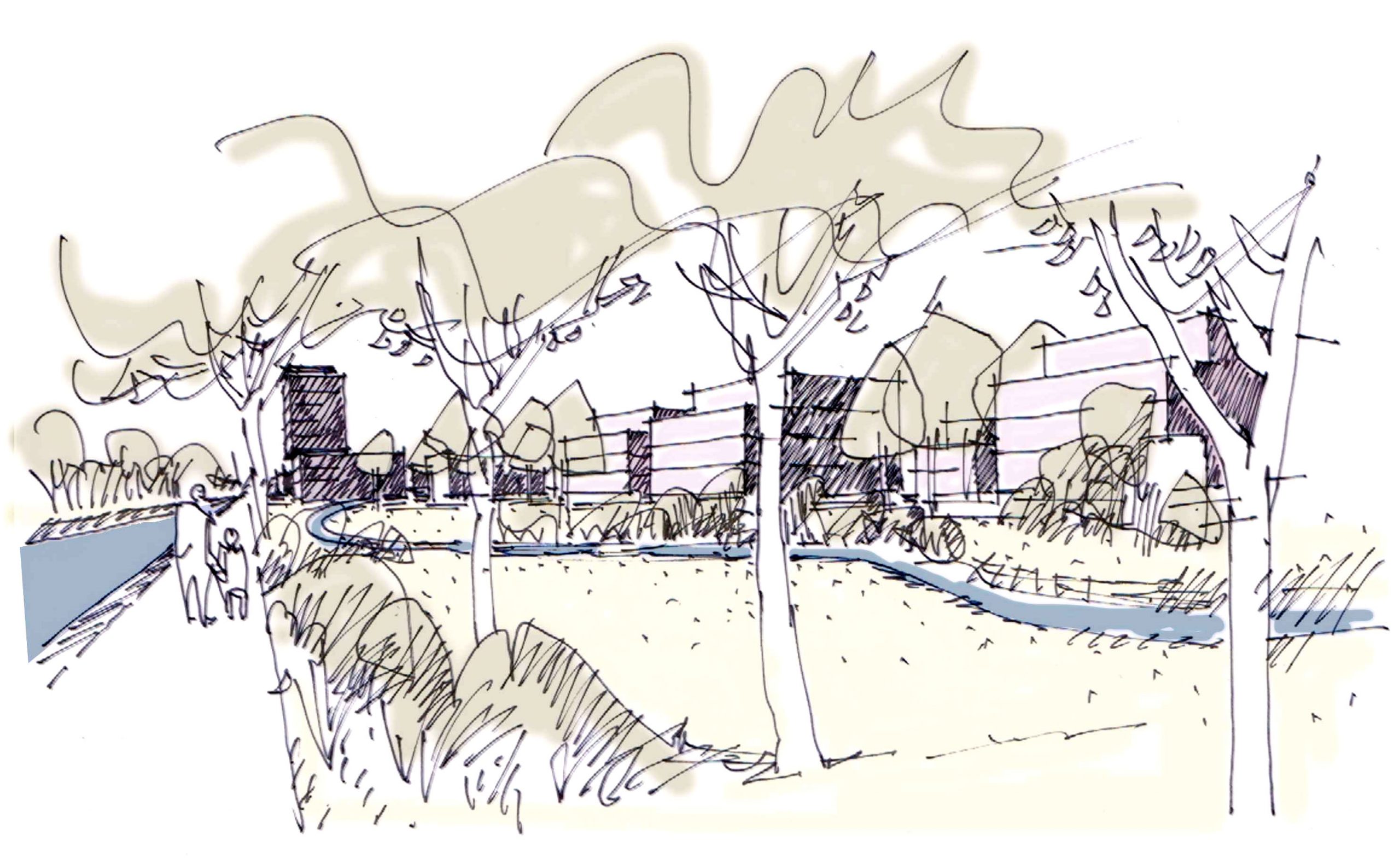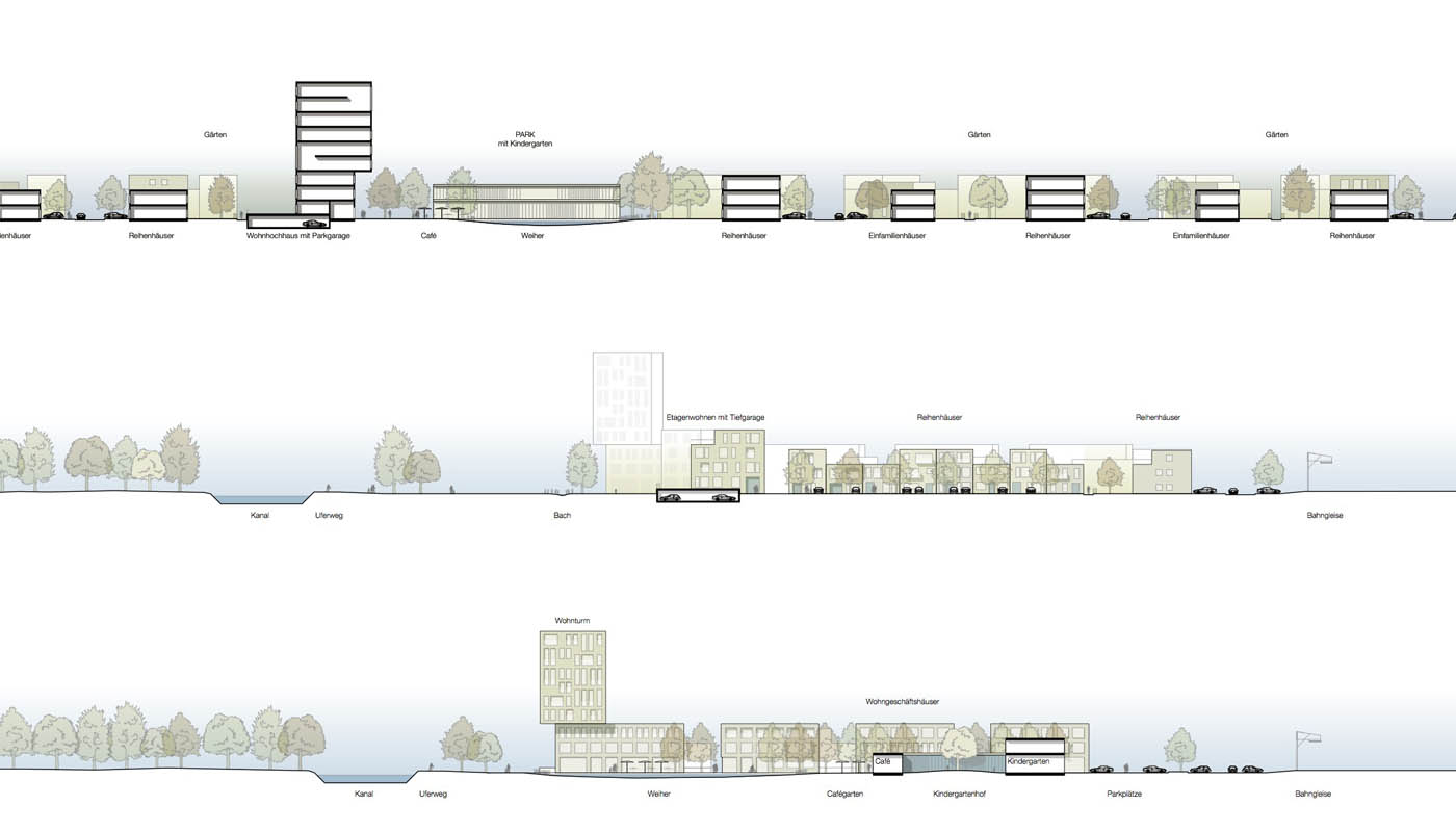 The site is the last piece in the chain of the developments along the canal – historic spinning mill park, the new housing area and the site – currently an industrial area. Our project concentrates the development into the north of the plot, where the connecting street and the railtracks are, in order to leave a continuous green stripe along the canal in the south. Two neighborhood clusters arise. The one in the east is aligned parallel to the railtracks, the western cluster parallel to the canal. The neighborhoods are connected by a green space with a public building and a promenade connecting the neighborhood north of the tracks to the canal. The new park between the neighborhood clusters and the canal with generous green space function as retention surface. The green space continues as fingers towards the north between the building rows. The residential areas offer a mixture of different housing typologies and forms of living, reflecting the needs of demographic mixture. The row and town houses with max. 3 levels offer options to suit different income levels and stages of life. The single-family houses are designed as “growing houses”: they can be optionally expanded or shrunk. The building rows in the north shield the area from noise of passing trains and make for a pleasant south oriented whole.