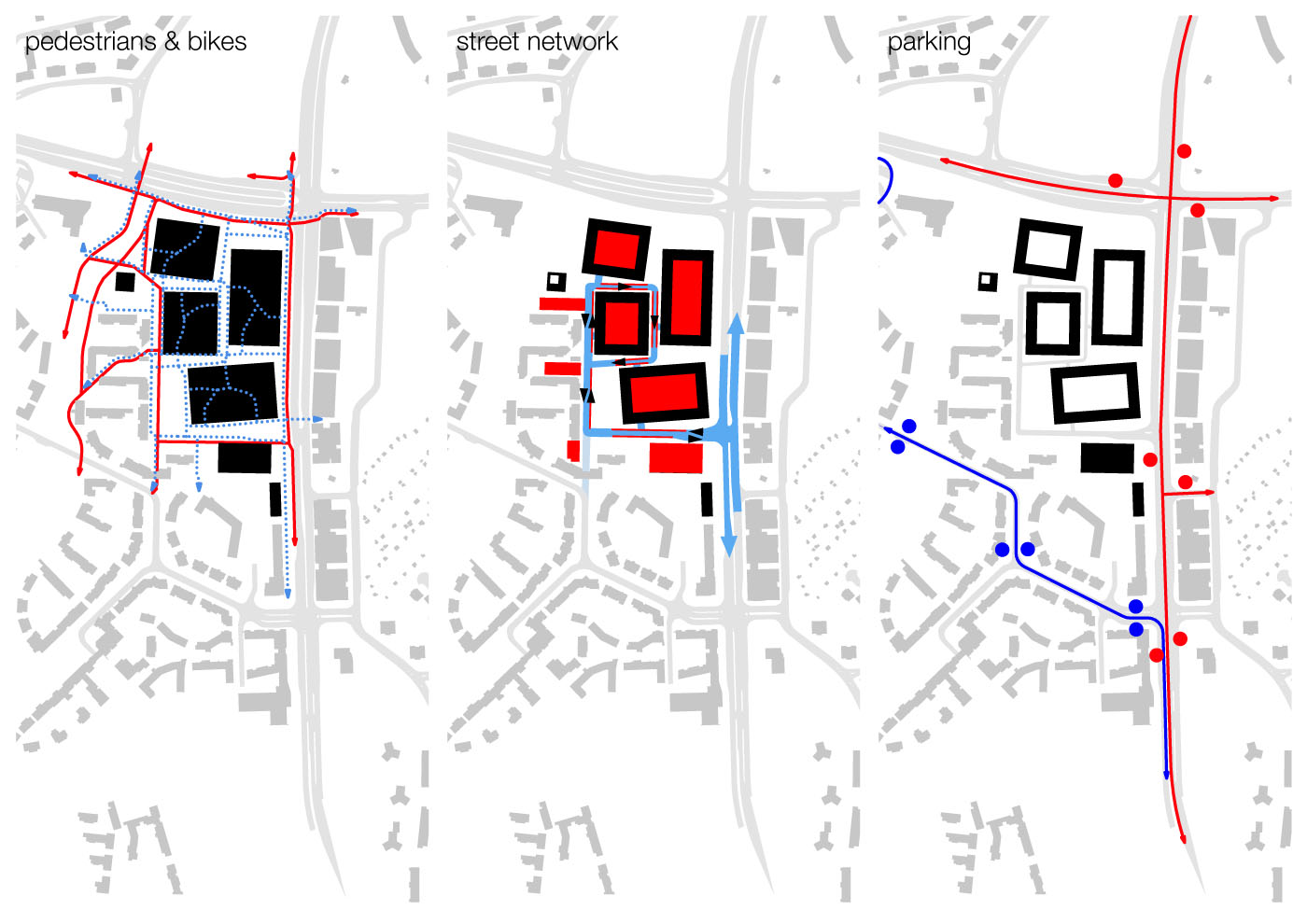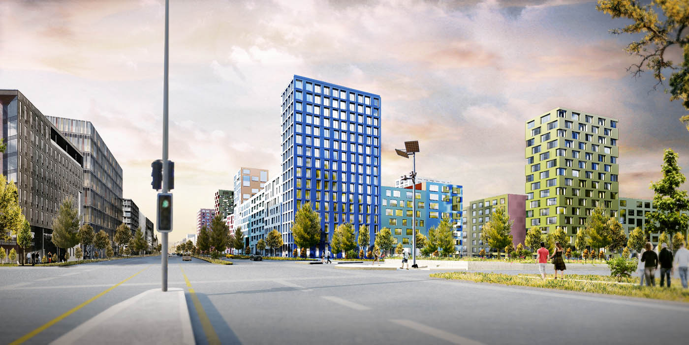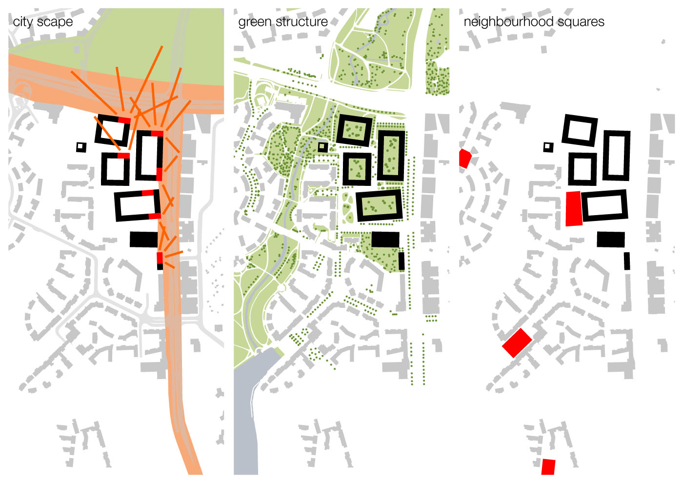 On a prominent site at one of the main entrances to the inner city of Helsinki a new residential quartier is developed. After several studies a solid urban block-layout was chosen as the basis framework for the new neighborhood. High density perimeter blocks are combined with accentuating high-rises along the main entryway passing the quarter. The new neighborhood integrates itself to the existing Quarter Pikku-Huopalahti by adding to the color-scheme and by creating a new addition to the network of public spaces – the new square becomes a meeting place for the old and new residents. The well connected layout creates differentiated urban spaces and situations supporting the emergence of urban life. At the same time the ample courtyards create peaceful and intimate, yet communal, spaces in a smaller scale. In order to create a pleasent urban environment an to maximize the efficient use of land parking is integrated in to the blocks under the courtyards – the courtyards become more intimate and receive more sunlight. The simple block concept combined with strong color concept allows for typological and architectural richness without loosing the common neighborhood identity.