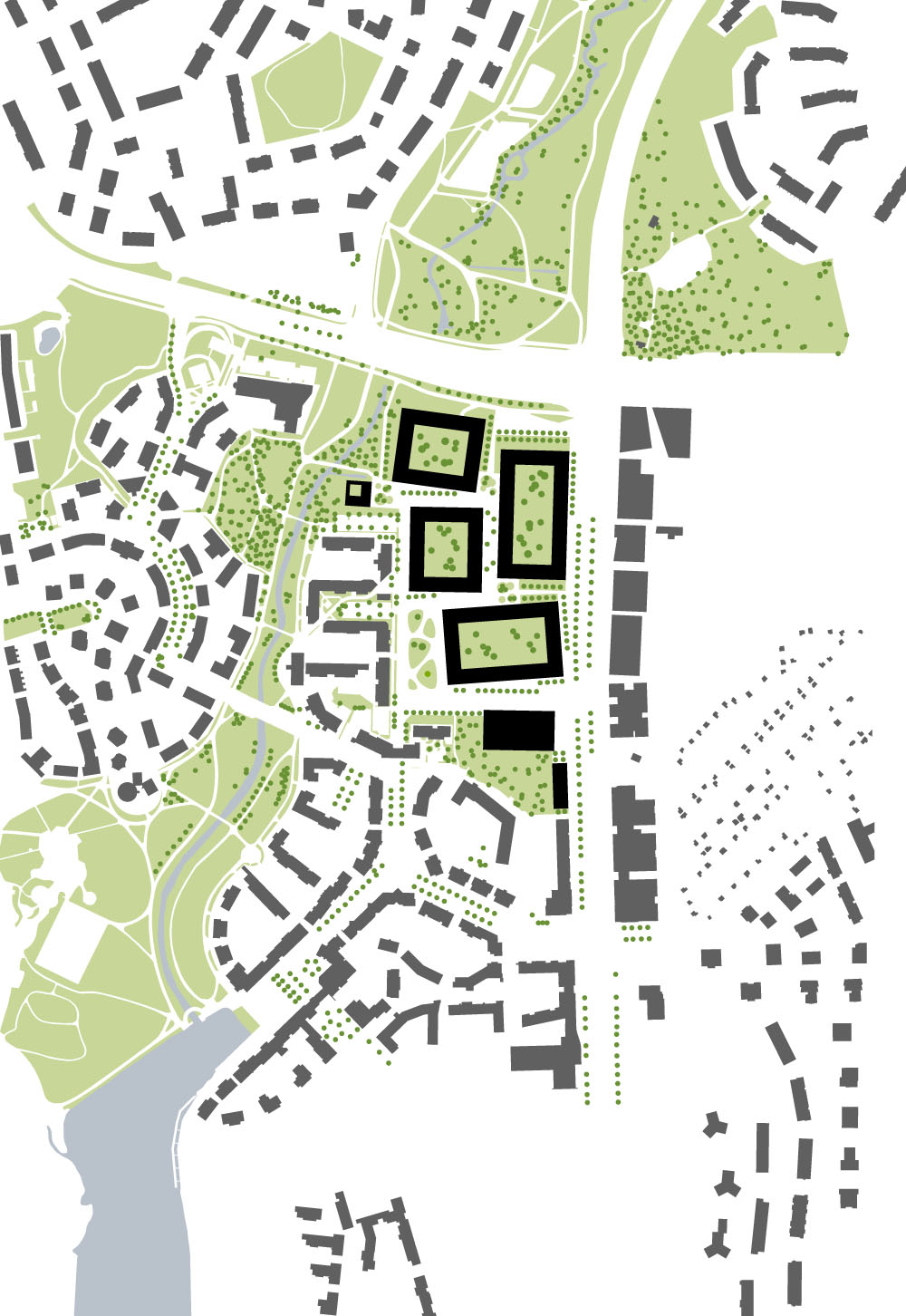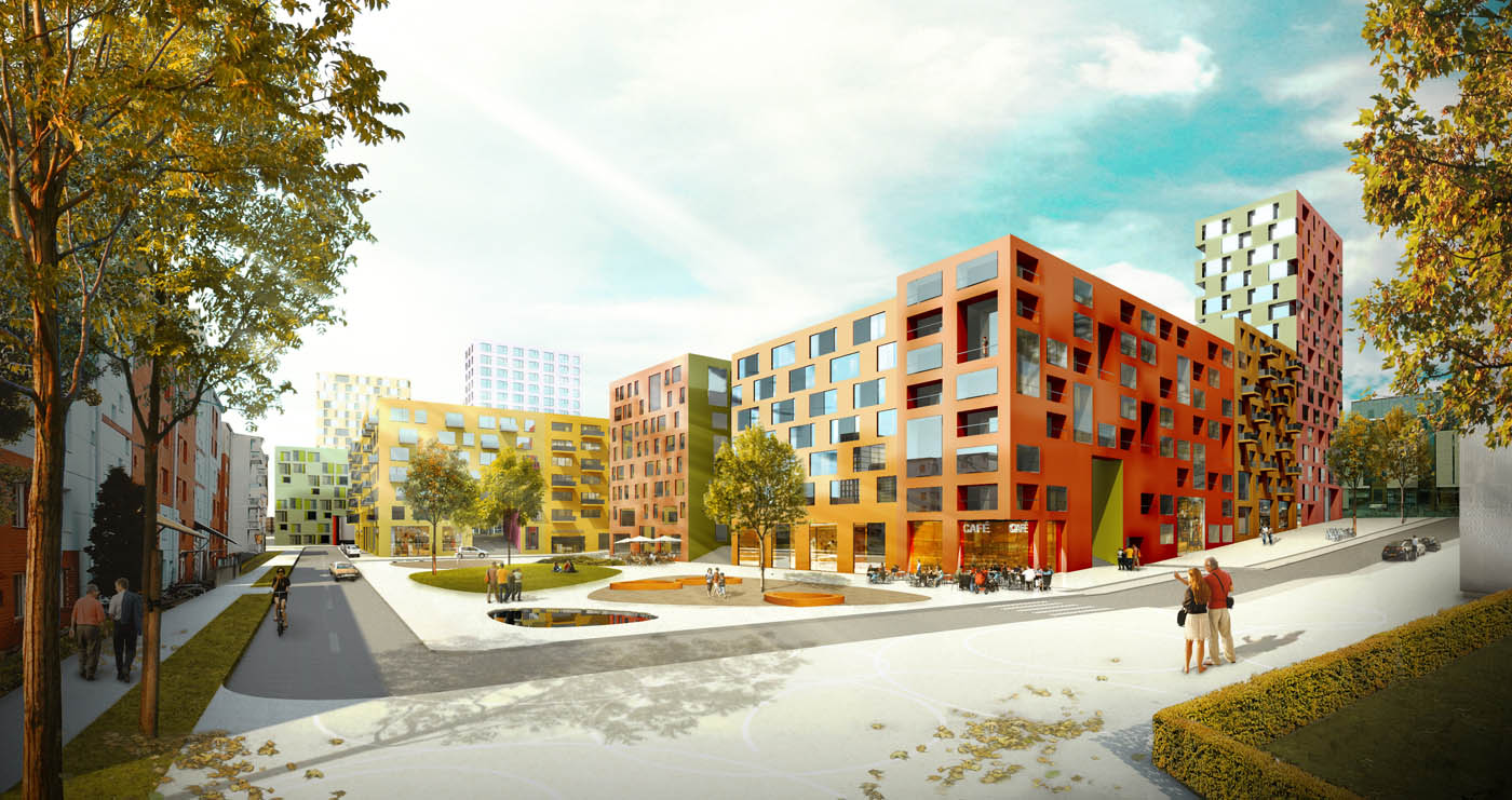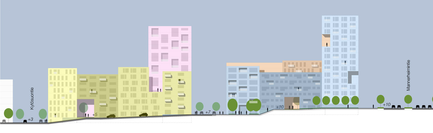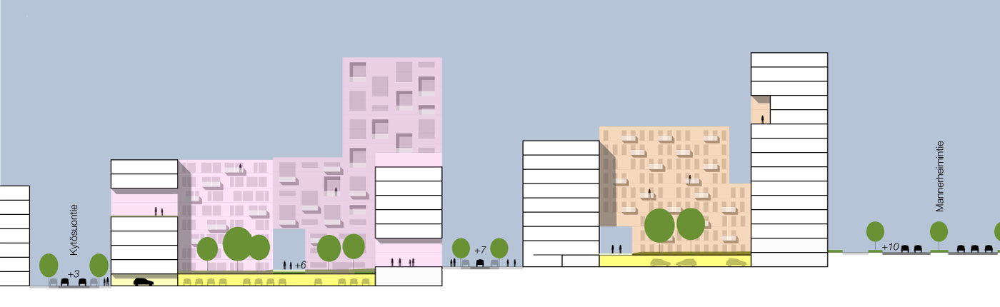 On a prominent site at one of the main entrances to the inner city of Helsinki a new residential quartier is developed. After several studies a solid urban block-layout was chosen as the basis framework for the new neighborhood. High density perimeter blocks are combined with accentuating high-rises along the main entryway passing the quarter. The new neighborhood integrates itself to the existing Quarter Pikku-Huopalahti by adding to the color-scheme and by creating a new addition to the network of public spaces – the new square becomes a meeting place for the old and new residents. The well connected layout creates differentiated urban spaces and situations supporting the emergence of urban life. At the same time the ample courtyards create peaceful and intimate, yet communal, spaces in a smaller scale. In order to create a pleasent urban environment an to maximize the efficient use of land parking is integrated in to the blocks under the courtyards – the courtyards become more intimate and receive more sunlight. The simple block concept combined with strong color concept allows for typological and architectural richness without loosing the common neighborhood identity.