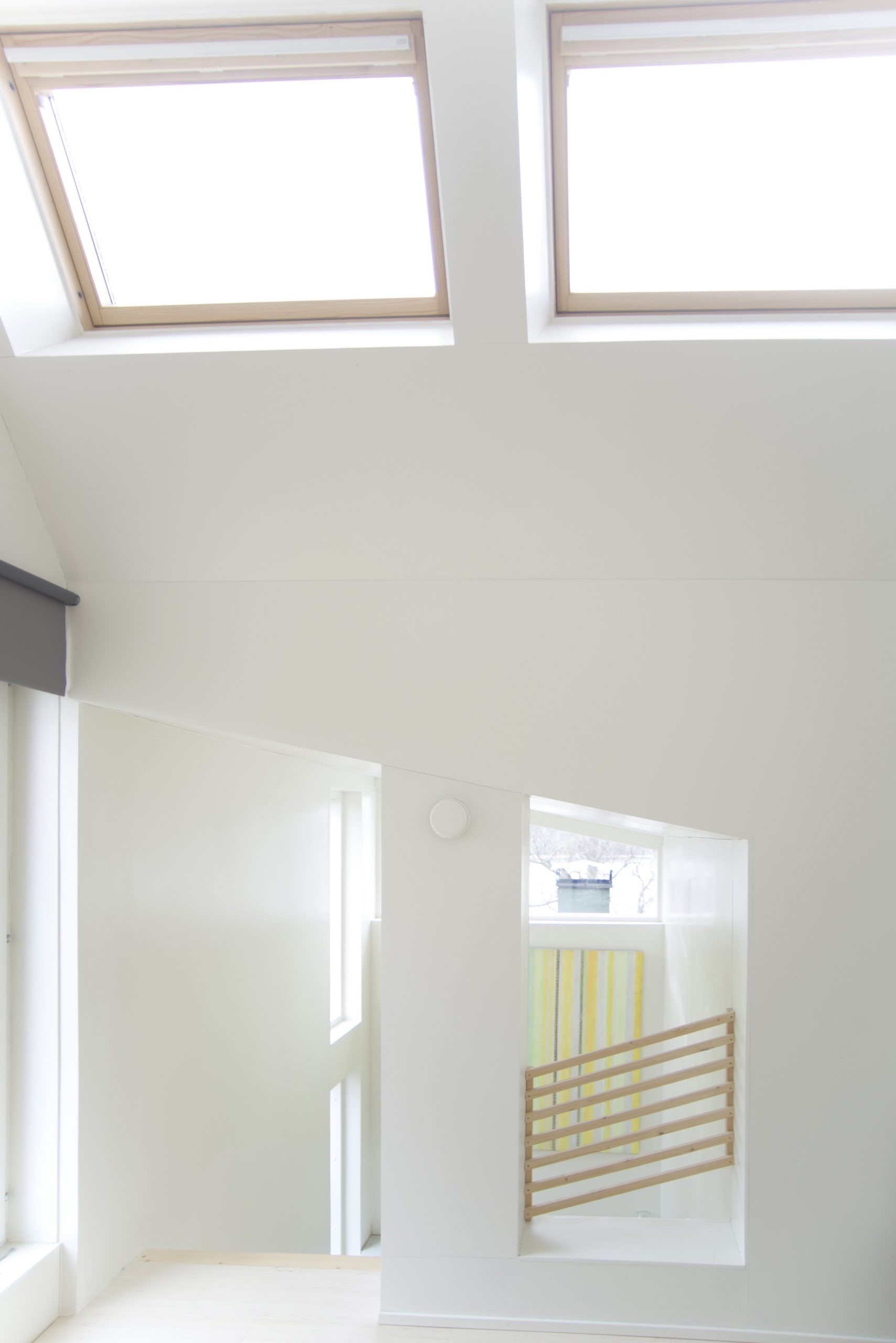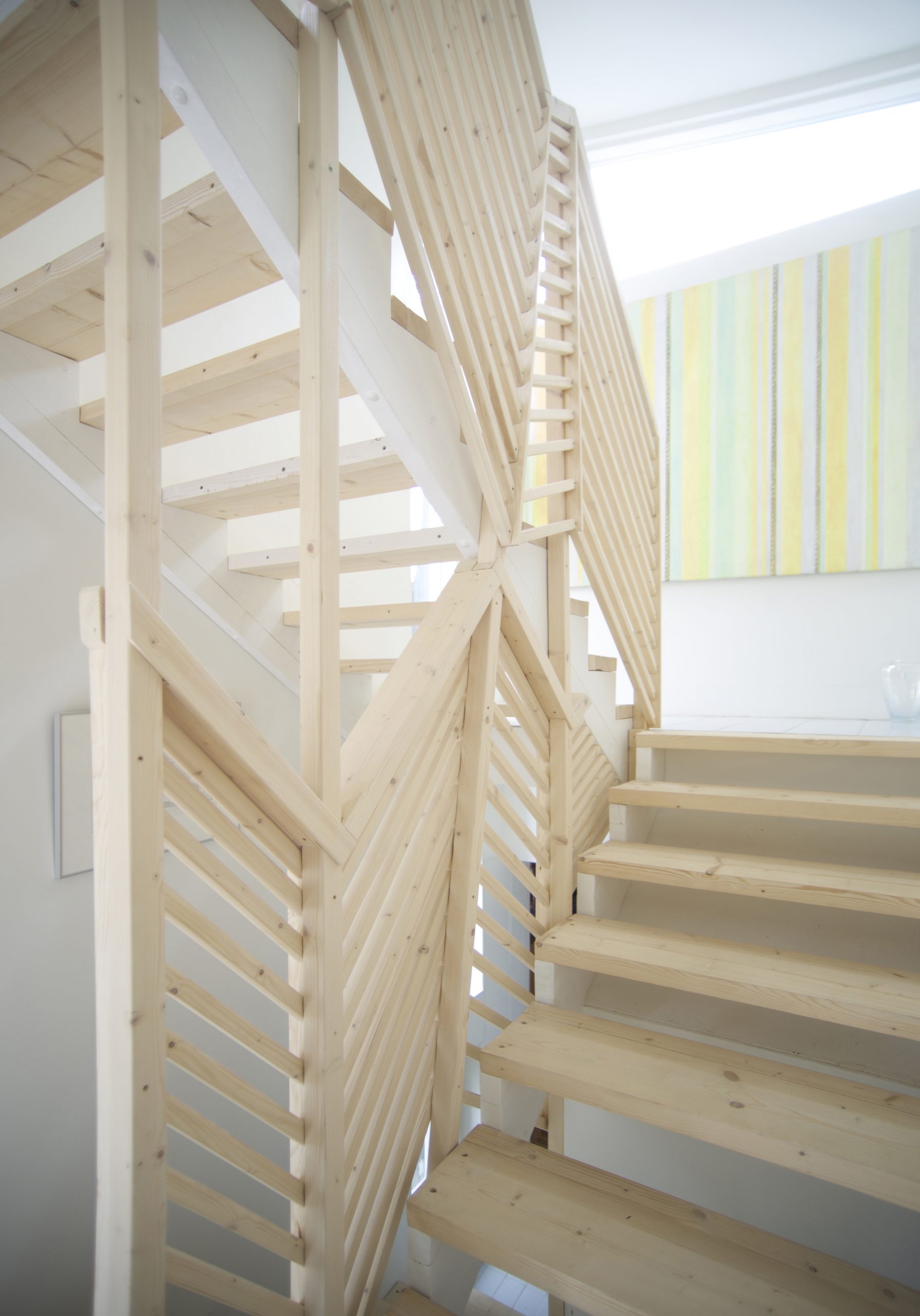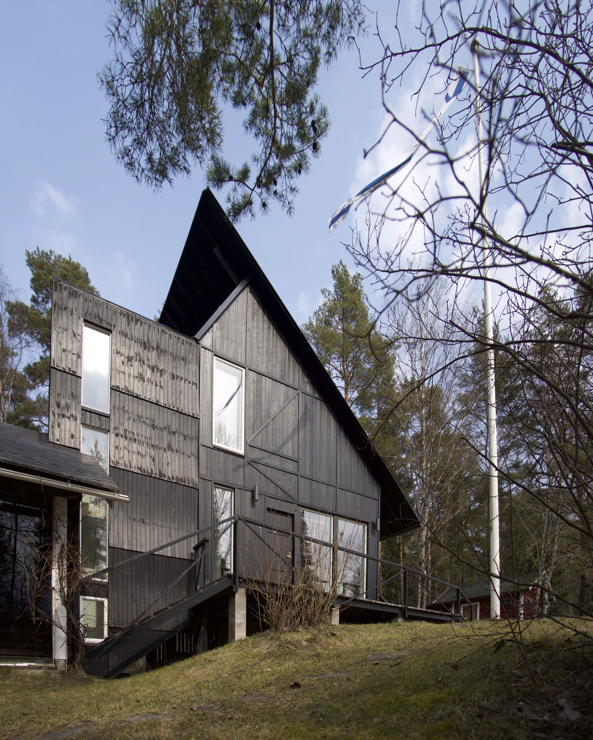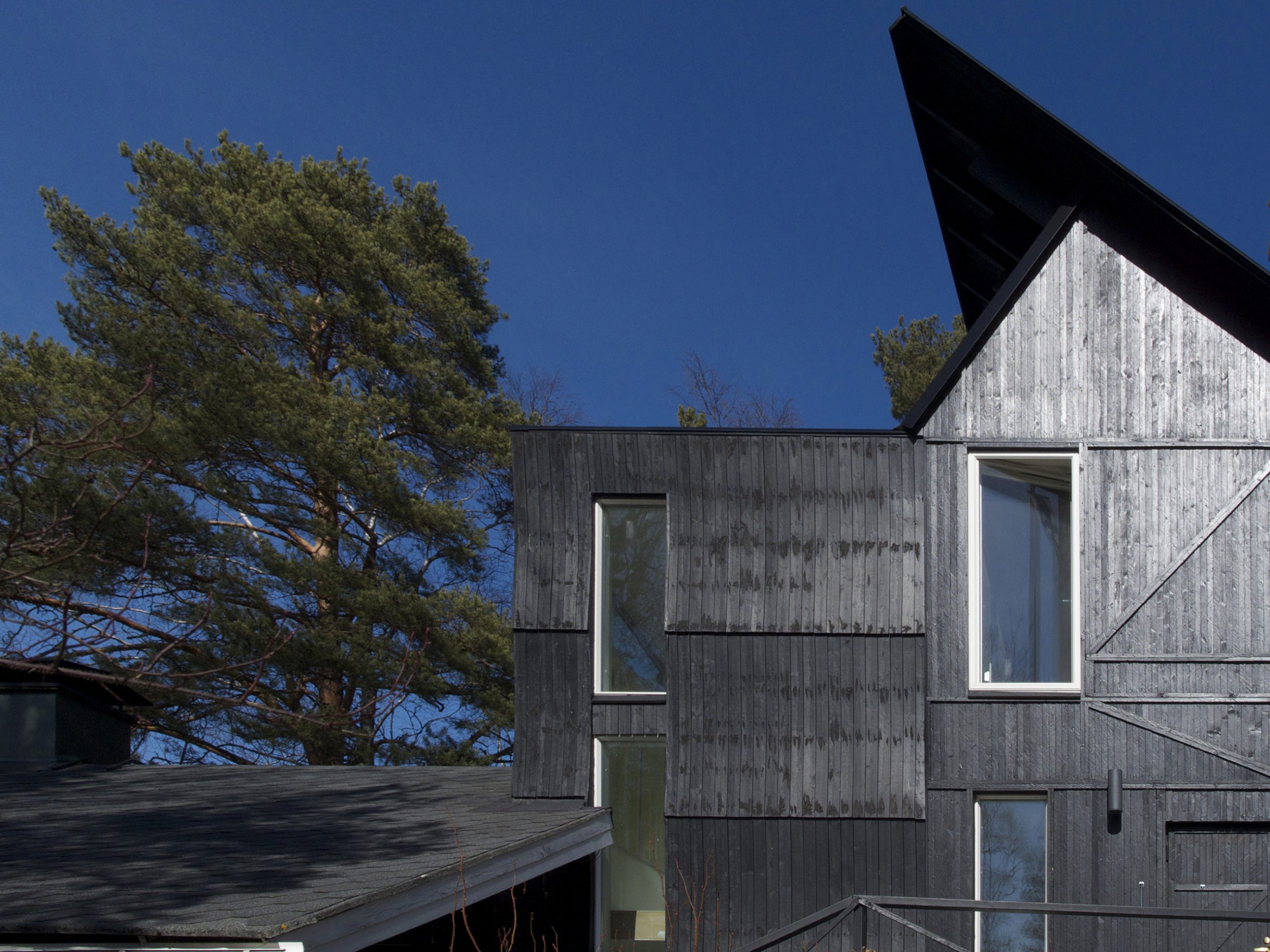 A log building, built in 1951, has been extended to create a new residential unit. The name of the house refers to the desired atmosphere and dynamism. The Japanese garden surrounding the building is due to be completed in the near future. The design concept was a four-storey-high building with a very steep roof plane. The roof is indeed like the slash of a samurai sword. Another aesthetic goal was to give an architectural interpretation of the mind-set of the so-called Helsinki School of photography. The project involves an innovative building technique. The roof was first built in the horizontal plane and then, using huge hinges, gradually turned upright. This removed the need to climb on the roof. The interior balustrades are an expressionistic artwork. A variety of unique uses of wood have been experimented with in the facades, such as scaly planks that curve longitudinally. Part of the facades has been subdivided into cassettes in accordance with the bearing structure. The facade boarding was made from the scaffolding used during the building construction by sawing the planks on site into scantlings.